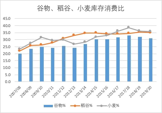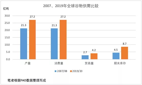 从全球粮食供求形势看,2019-2020年度全球谷物产量达到27.1亿吨,贸易量4.2亿吨,库存量8.6亿吨,分别比2007年增加了27%、54%和97%;谷物库存消费比达到30%;比2007年提高了10个百分点,(库存消费比是衡量粮食安全的关键指标,FAO认为保障世界粮食安全所必要的起码水平是库存占消费量的17%-18%),小麦、稻谷的库存消费比均达到了35%,均比2007年提高了约13个百分点。