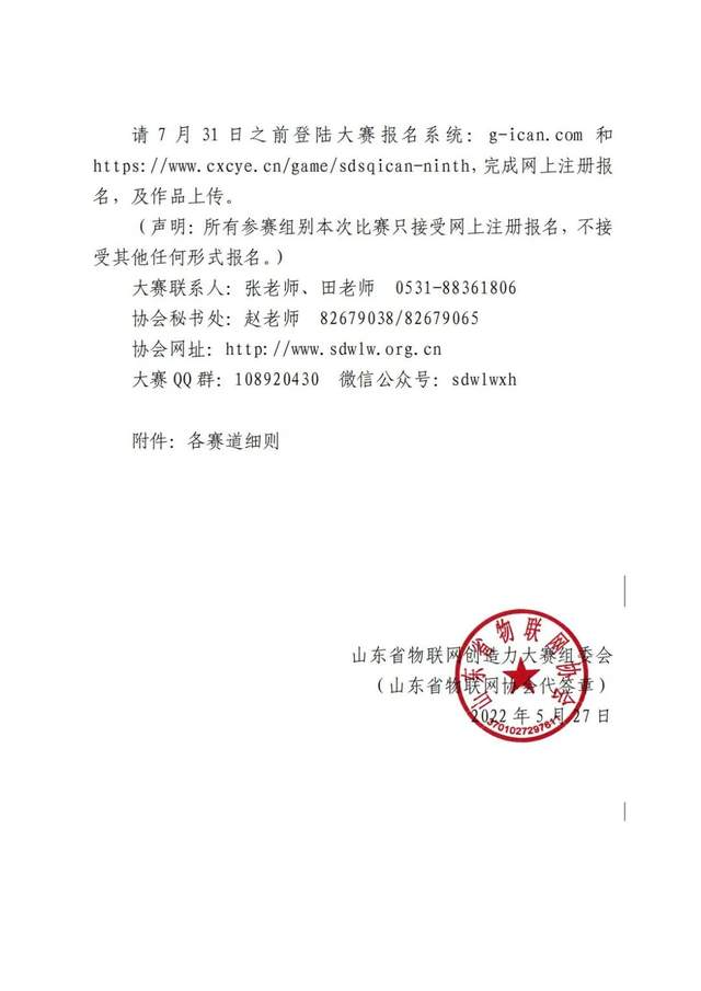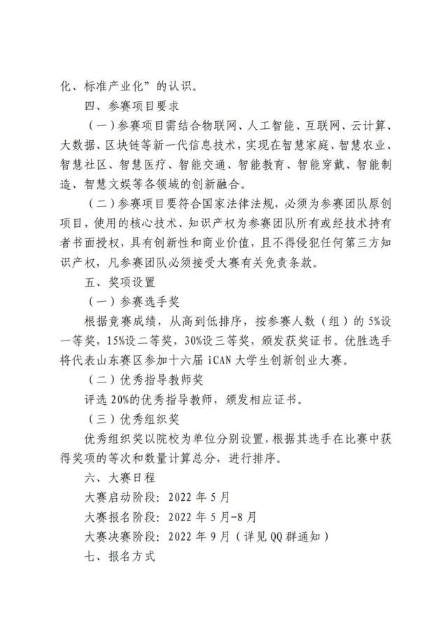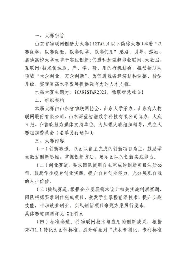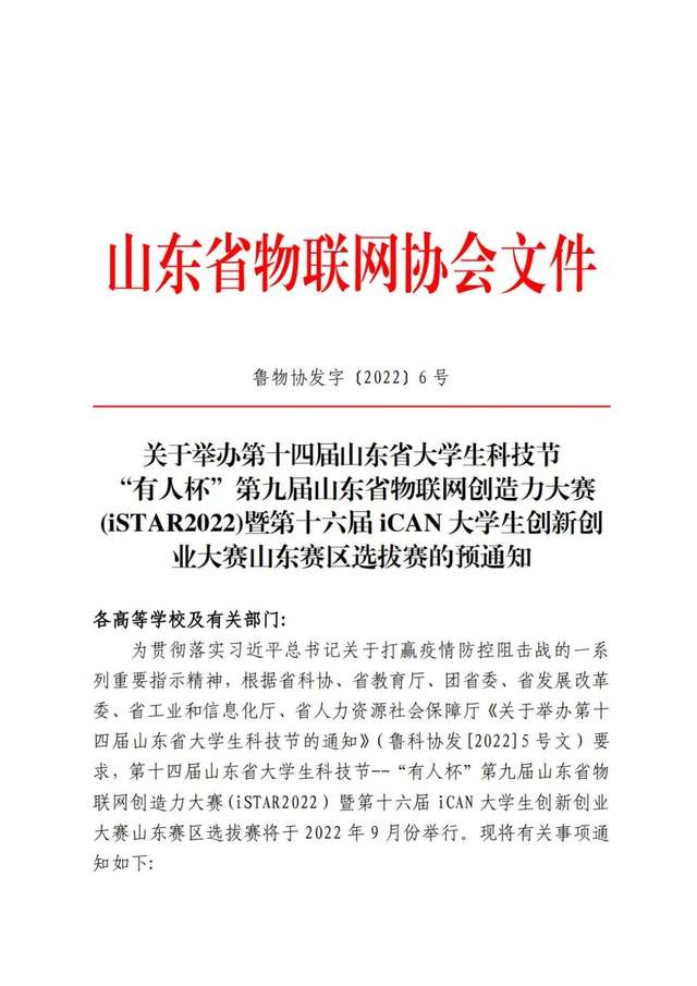 为贯彻落实习近平总书记关于打赢疫情防控阻击战的一系列重要指示精神,根据省科协、省教育厅、团省委、省发展改革委、省工业和信息化厅、省人力资源社会保障厅《关于举办第十四届山东省大学生科技节的通知》(鲁科协发[2022]5号文)要求,第十四届山东省大学生科技节--“有人杯”第九届山东省物联网创造力大赛(iSTAR2022)暨第十六届iCAN大学生创新创业大赛山东赛区选拔赛将于2022年9月份举行。现将有关事项通知如下: