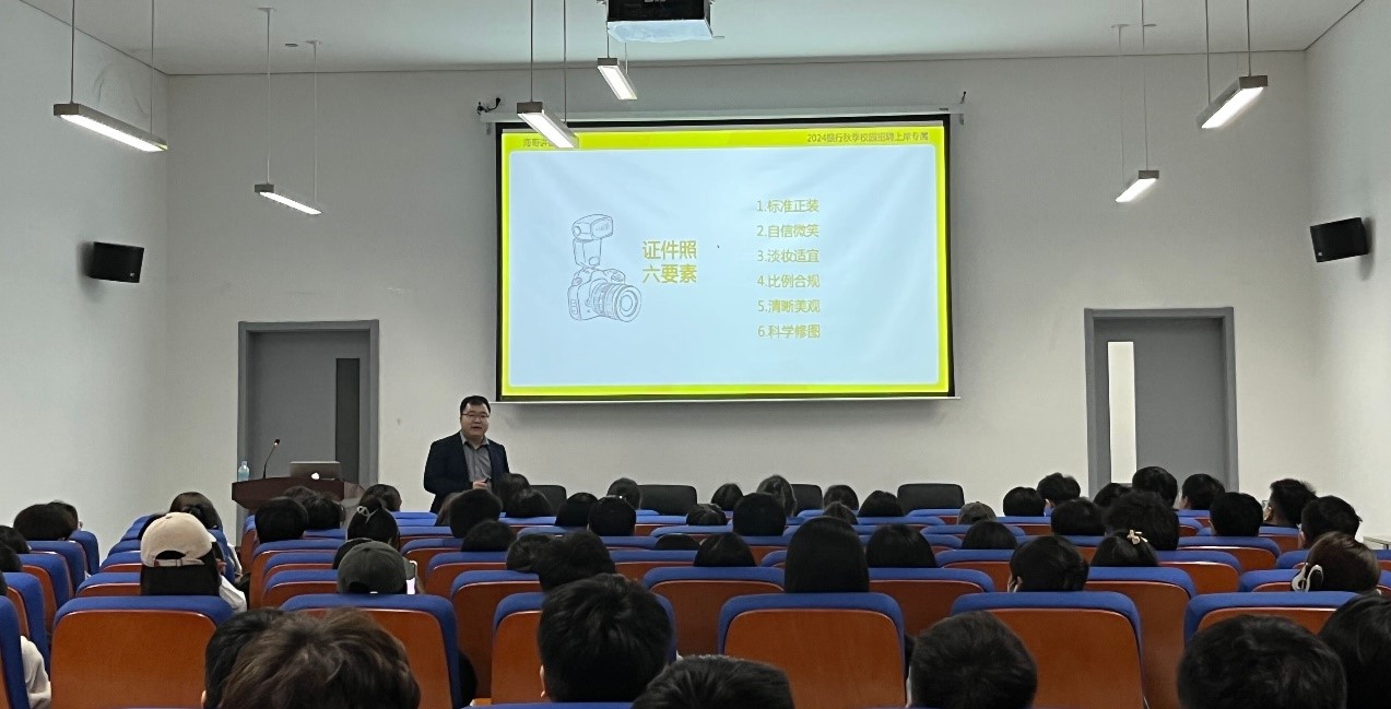 讲座第二部分,于海老师介绍了银行类型,分为国务院直属银行、国有六大行、股份制商业银行、城市商业银行和农村商业银行,指出了适合同学们报考的银行和报考这些银行应具备的条件。随后,于海老师对同学们关注的银行招聘问题进行讲解,他提到招聘分为秋季招聘和春季招聘,而其中秋季招聘机会多,占比大,应着力侧重秋季招聘,除注意银行网上发布的公告外,网上申报则是参加银行招聘的第一步。此外,于海老师还提醒同学们,网上申报则应注意证件照,证件照是同学们与考官见的第一面,选一张合适的证件照尤为重要,并为同学们详细列出了证件照六要素,其中包括标准正装、自信微笑、适宜淡妆、比例合规、清晰美观和科学修图。
