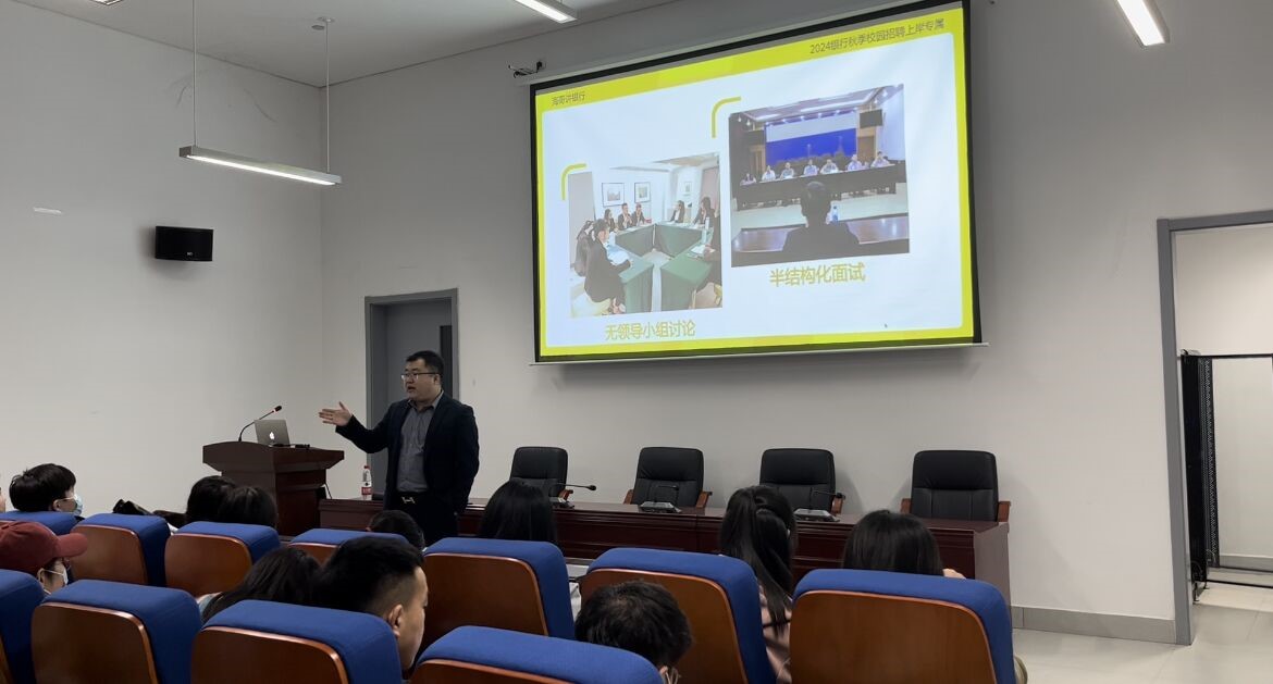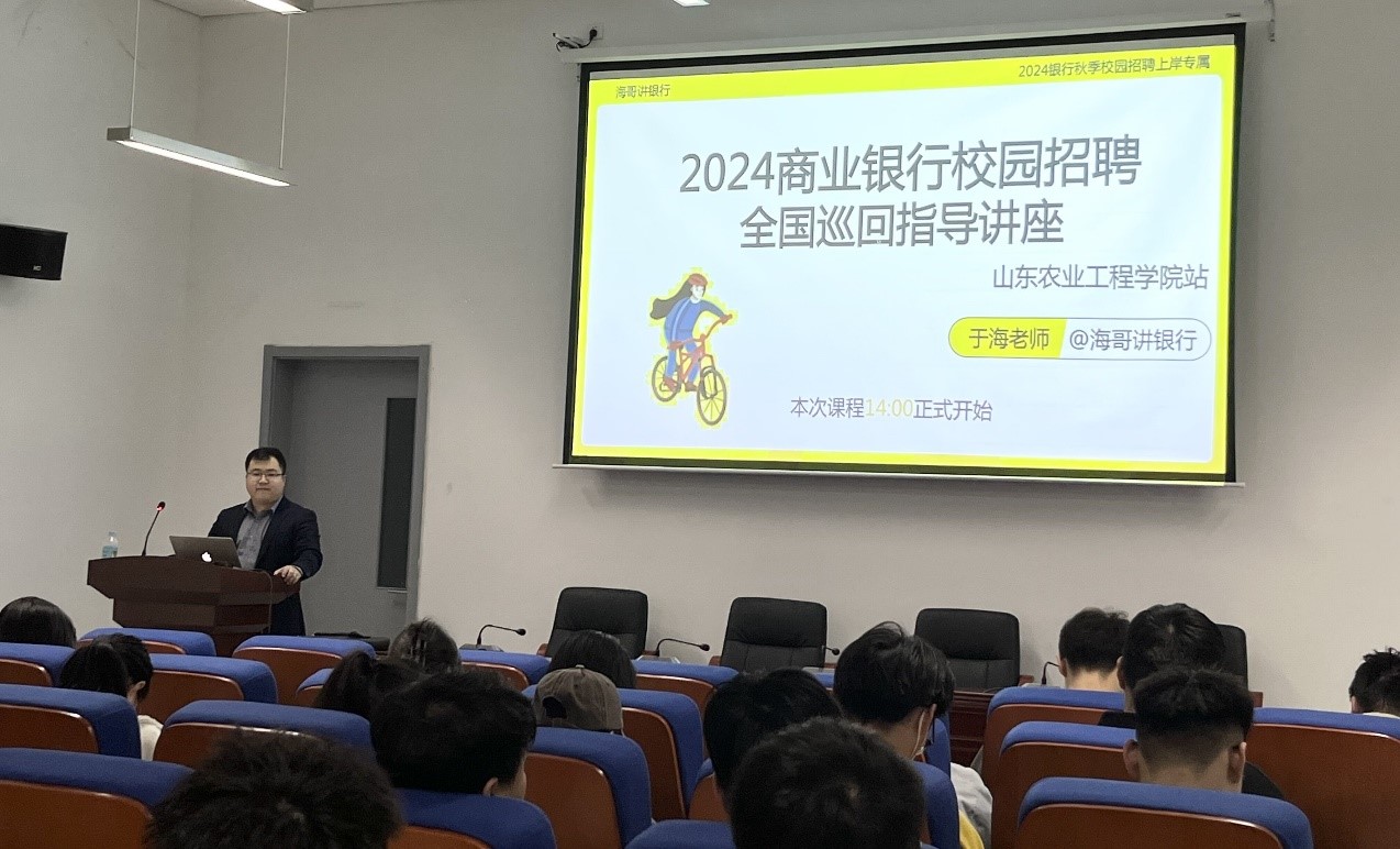 讲座开始,于海老师按照网上申报再到银行笔试最后进行面试的顺序概述银行招聘的内容,让同学们初步理解银行如何进行招聘。随后于海老师为同学们全面深入地介绍了国内银行招聘的基本情况和发展趋势,详细介绍了银行就业的优点,例如社会地位高、工作稳定、收入高、离家近等,并充分讲述了银行的薪资待遇、福利待遇、奖金等,又列举往年成功案例,为同学们考取银行增添动力。