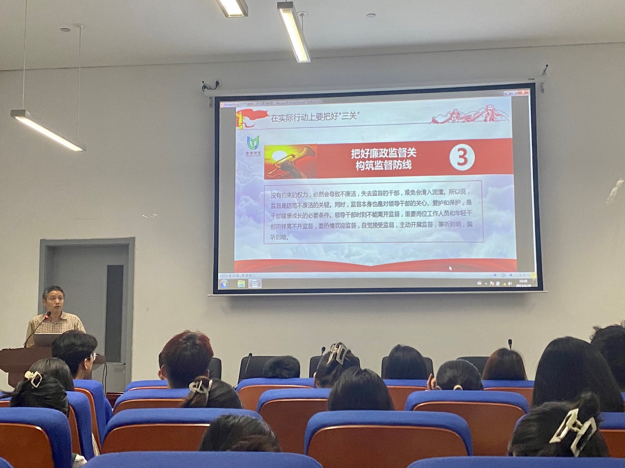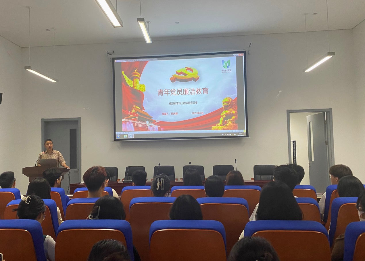 为增强青年学生党员、学生干部党的意识、群众意识和自律意识,信息科学与工程学院党总支于2023年6月28日下午18时在理工东楼A101报告厅进行青年党员廉洁教育主题党课,参与人员有非毕业生党员、预备党员和学生会主要成员,本次党课由信息科学与工程学院党总支副书记孙向群授课。
