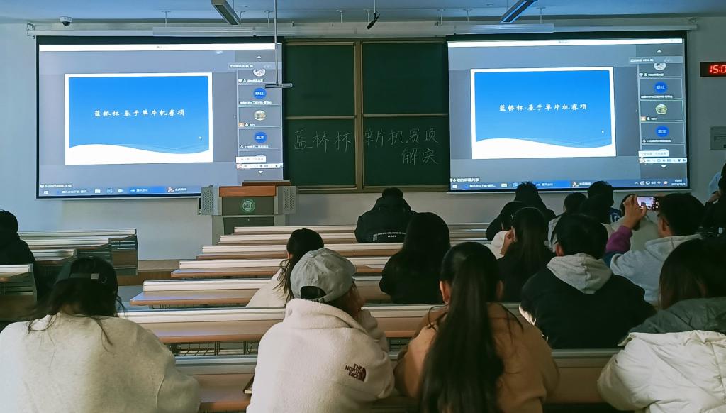 首先,老师播放了一个关于蓝桥杯大赛的宣传视频,让同学们对蓝桥杯比赛有了一个初级理解。接着,讲解人员对蓝桥杯-单片机赛事进行了一番讲解,包括比赛形式、比赛涉及到的知识范围以及参加赛事的好处。让同学们对蓝桥杯有了一个更深层次的认识。紧接着,讲解人员跟同学们分享了一些参赛经验和比赛易错细节。随后,讲解人员跟同学之间进行了问答环节,对学生提出的问题进行了详细的解答。最后,参与讲座的老师鼓励同学们积极参与比赛,抓住可以锻炼提升自己的机会,以提高自己创新实践能力。