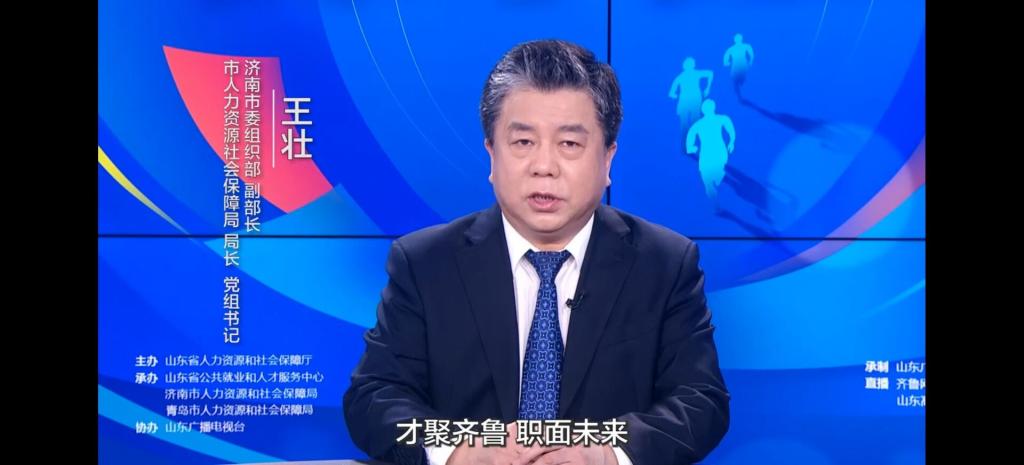 2022年4月28日下午,山东广播电视台播出了“才聚齐鲁、职面未来”就业服务进校园的直播。本次直播邀请济南市委组织部副部长、济南市人力资源社会保障局局长、党组书记、专家王壮进行主讲,由山东省人力资源和社会保障厅举办,山东省公共就业和人才服务中心、济南市人力资源和社会保障局、青岛市人力资源和社会保障局承办,山东广播电视台协办。