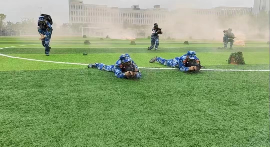 军乐连奏响国歌,国旗护卫队迈着铿锵有力的步伐护送国旗入场,标兵们分列于跑道一侧,全体师生庄严肃立,面向冉冉升起的国旗唱响《义勇军进行曲》,向国旗行注目礼。同学们军容严整、士气高昂,尽显新时代大学生的青春风采。微风伴着细雨,院旗迎风飘扬,大会正式拉开帷幕。迎着《中国人民解放军进行曲》,军训各连队开始分列式汇演,整齐的步伐、规范的动作、挺拔的身姿、嘹亮的口号、饱满的热情,展现出山工院学子积极向上、锐意进取的时代风貌,赢得了主席台上老师们的阵阵掌声。其中特殊联队,用连贯干练的刺杀操、整齐划一的军体拳和惊心动魄的烽烟演练向领导老师们展示了他们军训成果。