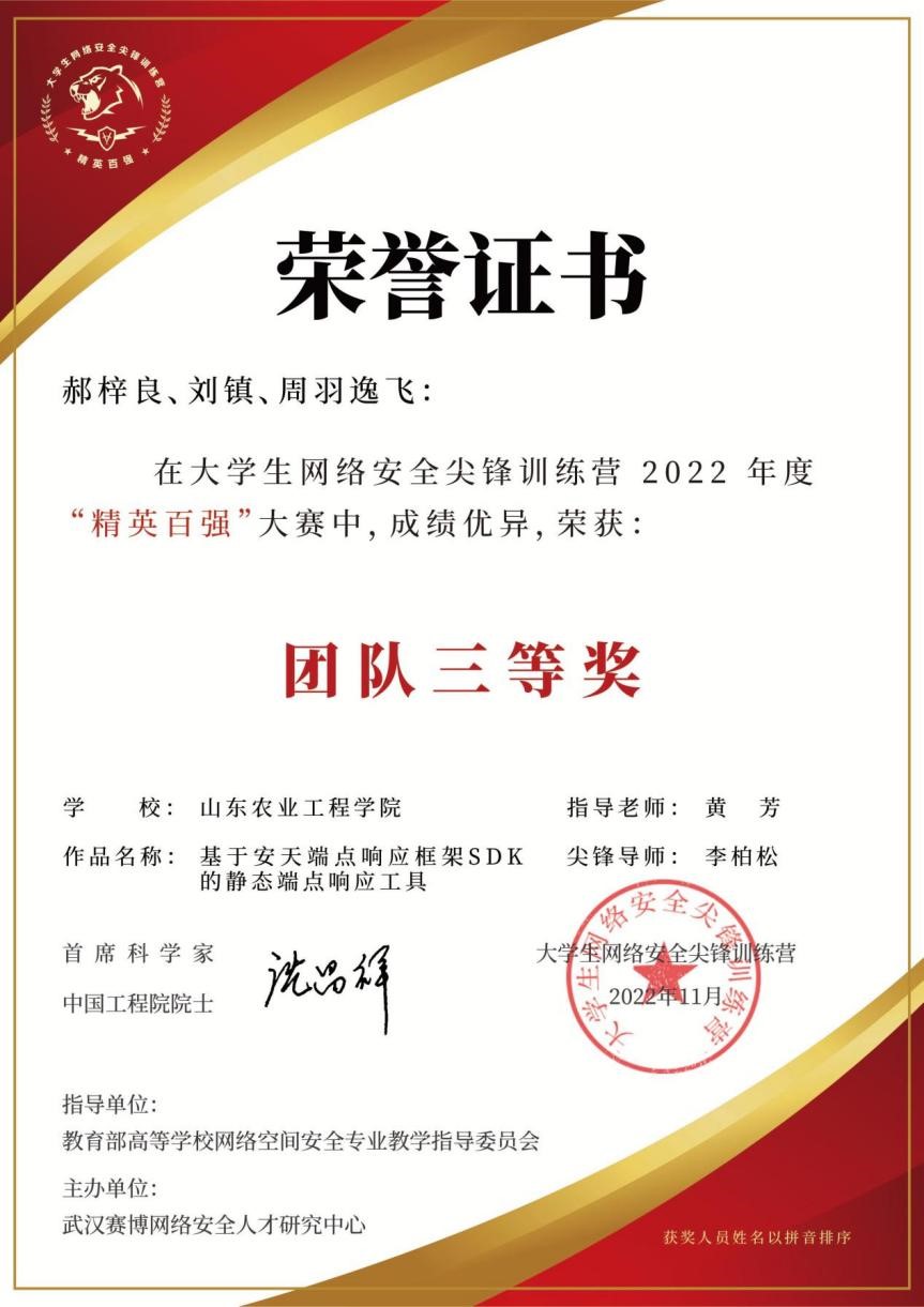 2022年11月23日,全国大学生网络安全尖锋训练营“精英百强”大赛总结表彰大会在江苏泰州召开。437ccm必赢国际官网信息科学与工程学院获得佳绩,来自2020级信息安全专业的参赛队伍“炊事员大队”荣获全国总决赛优秀团队三等奖,炊事员大队队长周羽逸飞,队员刘镇、郝梓良荣获年度精英百强学员,信工学院副院长黄芳荣获优秀指导老师,必赢荣获新晋联合培养基地。