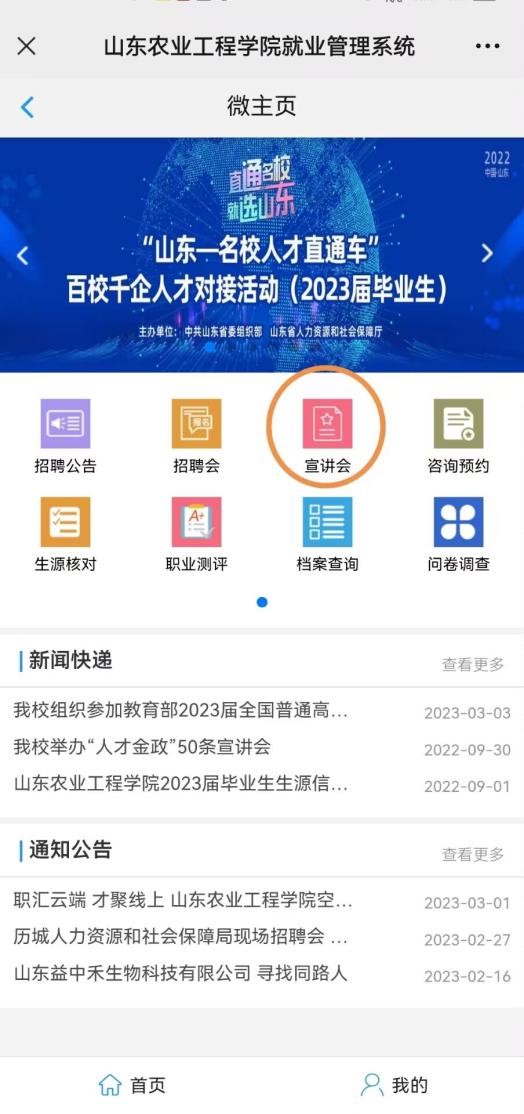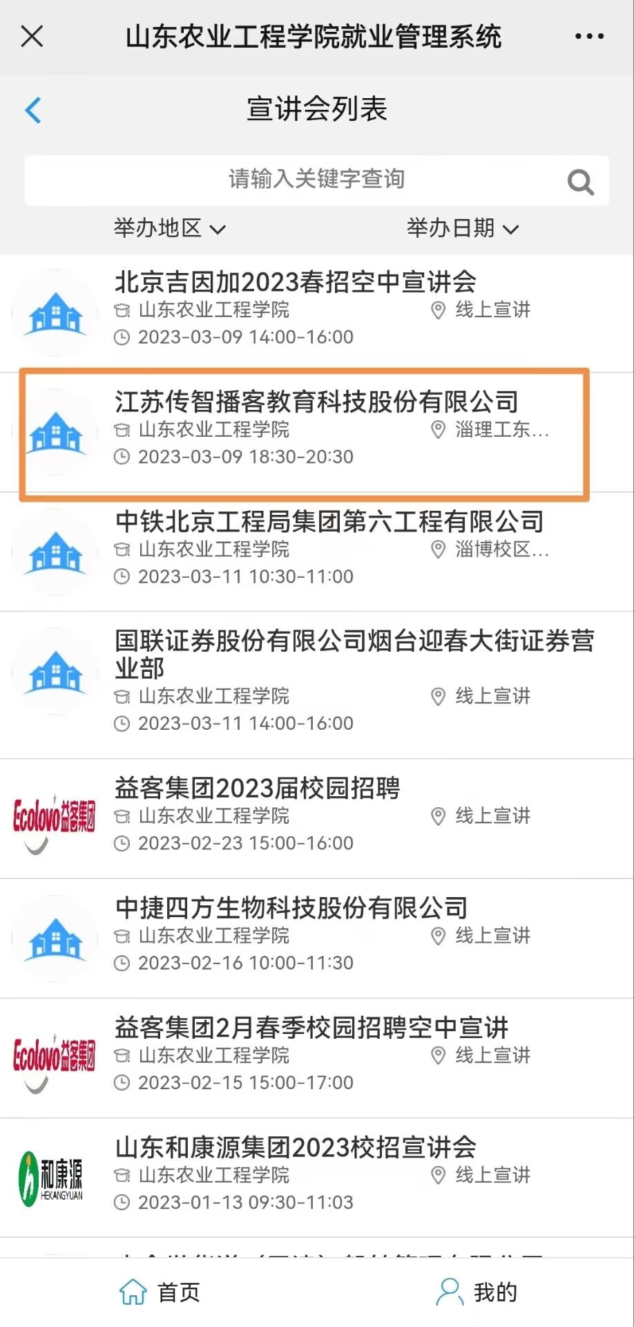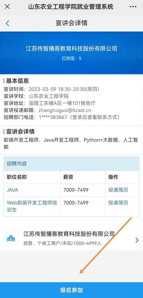 2、关注微信公众号山工院就业指导,进入微主页——点击宣讲会——选择江苏传智播客教育科技股份有限公司——点击报名参加