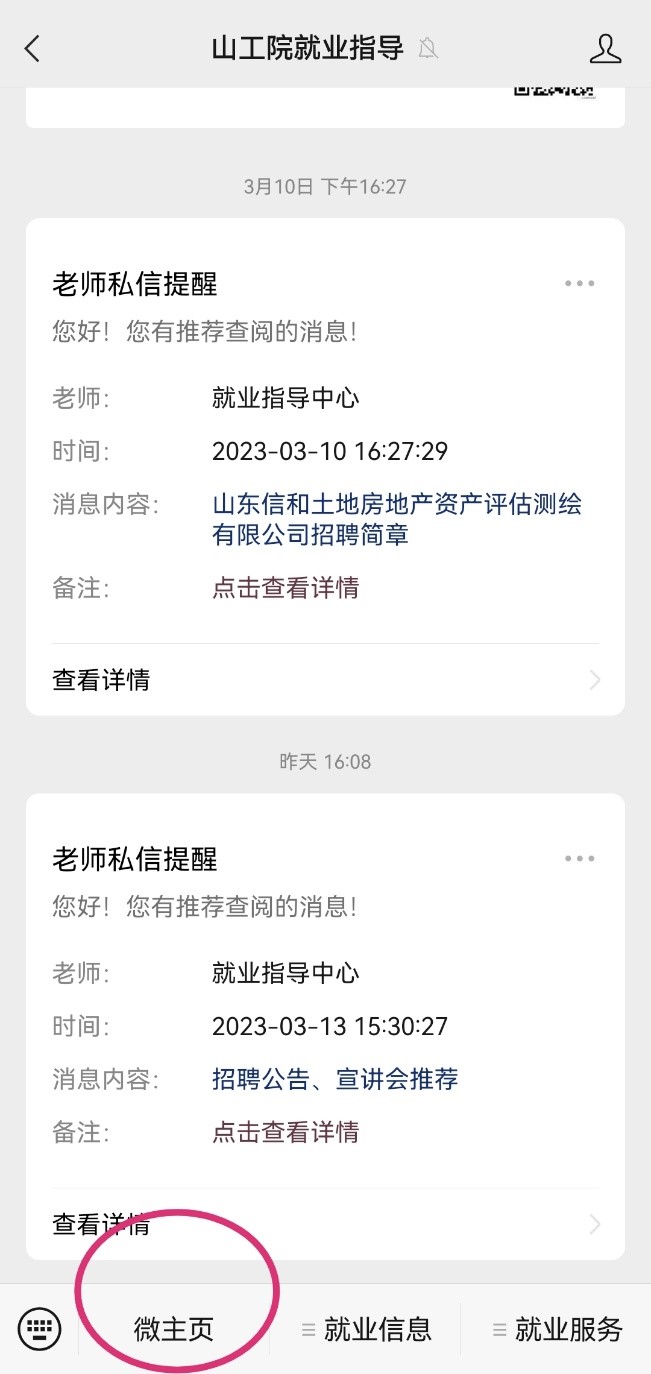 第一步:手机微信登录“山工院就业指导”公众号,关注后,点击“微主页“选项