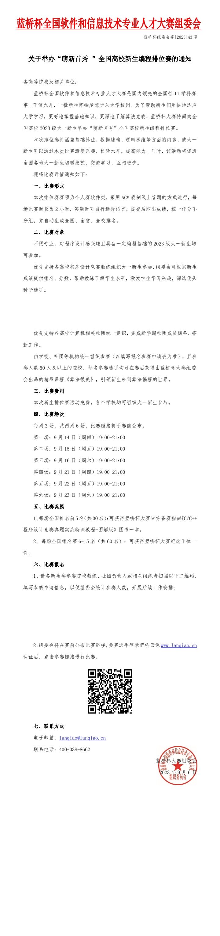 关于举办“萌新首秀”全国高校新生编程排位赛的通知