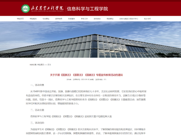 1.通过各班班长将活动通知转发至班级群内,积极鼓励班级内的同学依照活动通知要求开展《国旗法》《国歌法》《国徽法》专题宣传教育活动。同时通过学院官方微信公众号、学院官网等社交媒体平台,进行宣传推广,引导学生关注相关法律内容。