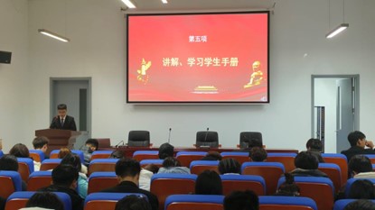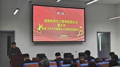 随即夏老师宣读《关于开展新生入学教育的通知》,从指导思想方面,应做到全面贯彻党的教育方针,领导新生坚定理想信念,爱国爱党,遵守组织纪律;在综合素养教育方面,鼓励我们增强综合素养能力;在发展规划教育、学业规划教育、职业生涯发展教育方面,将帮助我们不断提高全方面的能力。夏老师还提到了新生入学教育工作应该贯穿到学生生活的各个方面,如积极主动开展班级教育,定期定点进行学生手册考试等。最后夏老师提出了工作要求,团支部应该积极帮助同学解决问题,并开展有创新有特色的入学教育宣传,不断地总结提升,不断地进步。