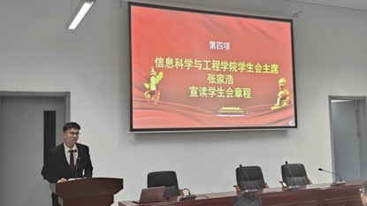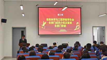 会议中叶,各部门成员介绍及宣读各部门职能,以便帮助学生会各部门成员更清楚的了解自己的职责,认清自己的优势,工作重心应该放在哪里,怎样去做才能更高效的完成工作。会议徙尾,信息科学与工程学院学生会主席张家浩宣读学生会章程。张家浩主席指出学生会的宗旨是为同学服务,学生会成员一定要及时解决同学们的问题。最后,由各位部长学习并讲解学生手册,这不仅提升了大家对学生手册的熟悉度,而且还可以更好的规范自己的行为准则,成为一名优秀的山工院人。