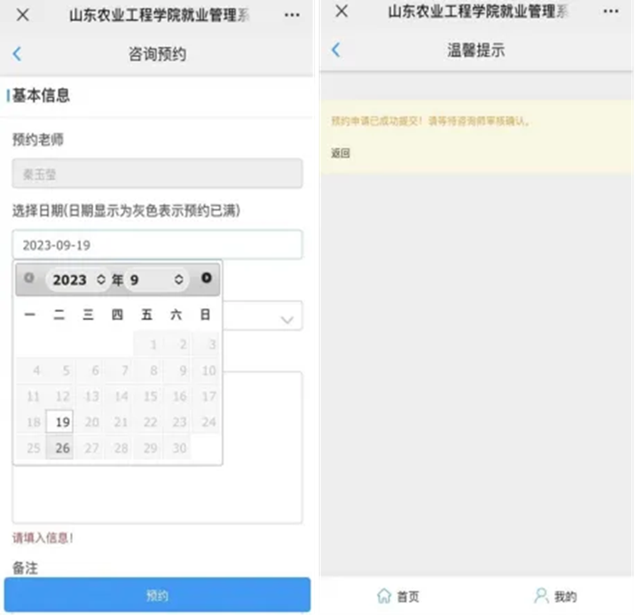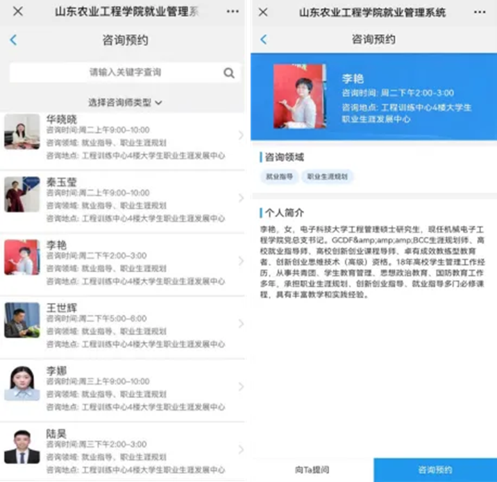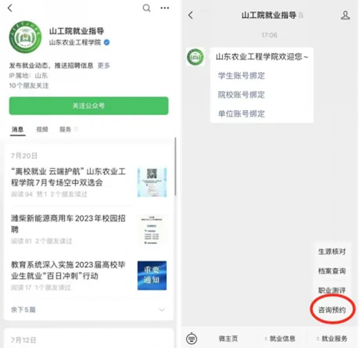 1.微信公众号搜索“山工院就业指导”,点击关注公众号>就业服务>咨询预约