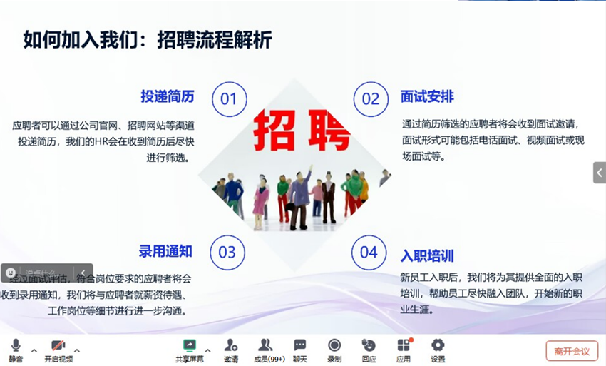 宣讲会上,公司还特别邀请了几位在公司工作的优秀员工分享他们的经验与感悟,他们从个人成长经历、工作挑战到职业规划等多个方面进行了分享,给参会的学生提供了宝贵的职场指导和灵感。为了让参与者更深入了解公司的日常运作和工作环境,鼎利卓远(山东)教育科技有限公司还准备了一系列的线上参观活动,通过视频展示公司的办公环境、企业文化等,让学生仿佛身临其境。