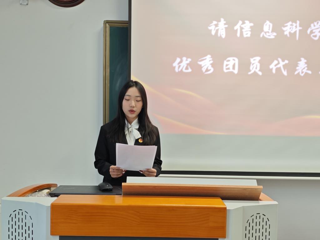 随后,由新团员代表胡晨曦和优秀团员王雅琦发言,表示在今后的学习和生活中努力奋斗,不负团组织的信任和期望。号召在共青团旗帜下承担责任,不断成长,为实现中华民族伟大复兴的中国梦贡献自己的力量。