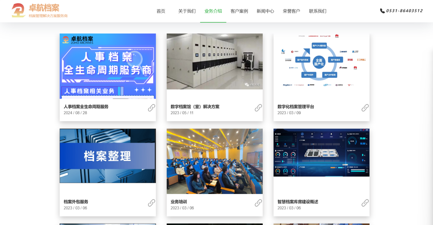 公司主营业务:打造档案智慧化管理、档案数字化管理,电子档案管理平台,数字档案馆(室)建设,智慧档案库房建设、档案数字化服务、咨询、职称培训、档案专业培训等服务。卓航拥有国家秘密载体数字化加工资质,省技术企业,软件著作权30项,等行业资质。目前卓航档案参与并承担2家国家示范数字档案馆、2家国家级数字档案室、200多家机关事业单位数字化服务、20多家智慧库房建设案例、山东省示范级档案业务评价2家,荣获山东省档案学会优秀成果奖一等奖1项。