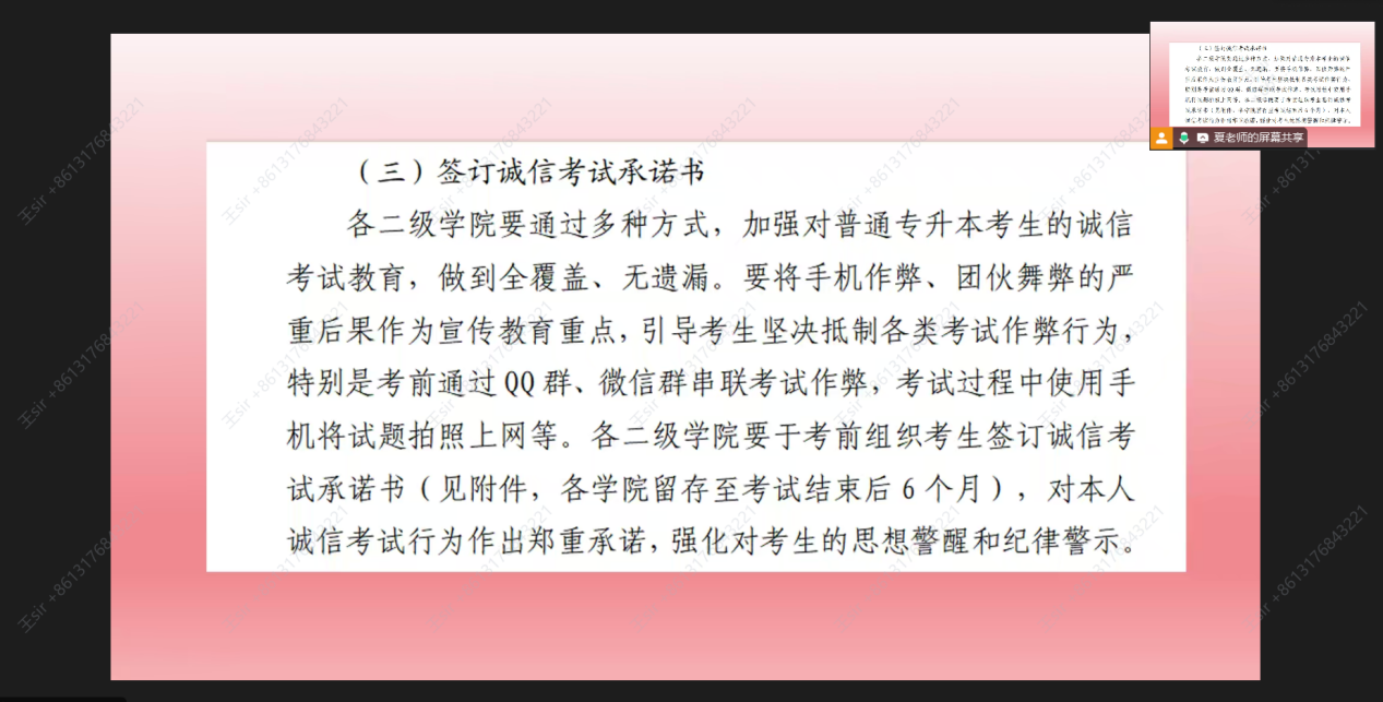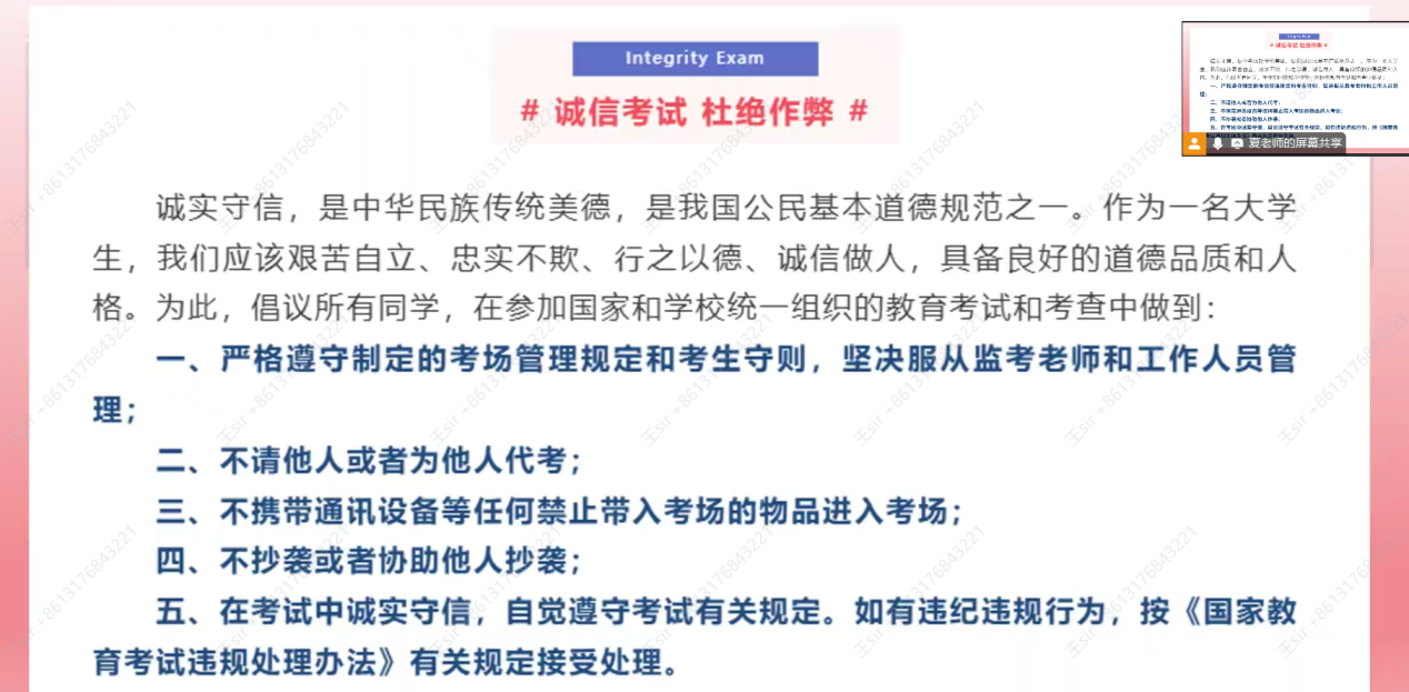 在会议中主讲人夏天宇老师对考前相关工作作出详细介绍,从如何阅读并签署承诺书到考前复习指南,夏老师讲解细致入微,抓住每一处细节,为学生们弥补缺漏。此外,夏老师多次强调严禁考试作弊等恶劣行为,据法律规定,考试作弊应承担相应的刑事责任,组织作弊或者帮助他人作弊同样依法处置。会议倡导绿色文明考试,希望各位考生发挥自己最好的实力,写出自己最满意的答卷。