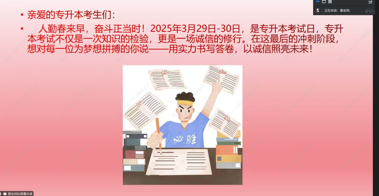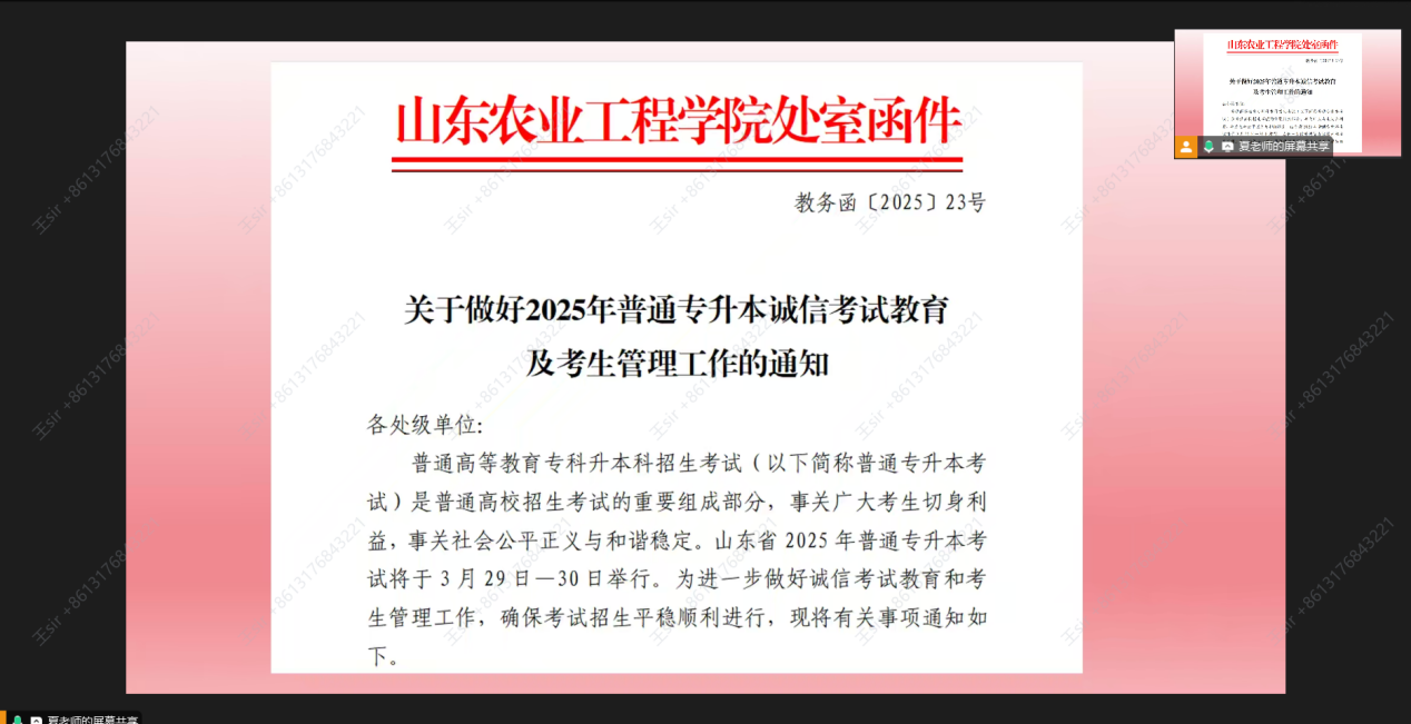 为确保2025年普通专升本考试平稳、有序开展,帮助广大考生以充分的思想准备和最佳的精神面貌迎接这场挑战。信息科学与工程学院于2025年3月13日开展了“2025年普通专升本诚信考试教育及考生管理工作”线上会议,本次会议由辅导员夏天宇主讲,学生们通过线上平台踊跃参与。