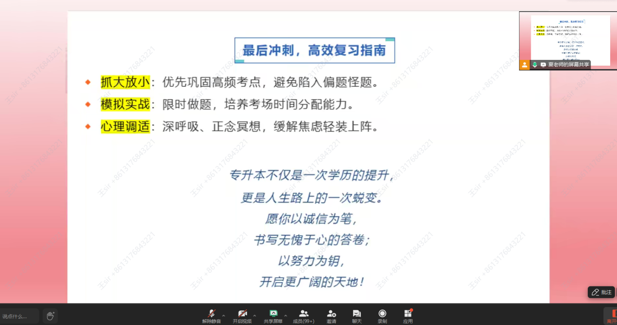 考前,学校加强对学生的纪律法纪教育,提高宣传指导服务水平,同时夏老师在线上会议中提醒各位学生按时参加报名、考试与志愿填报等环节,帮助学生们建立了一条较为清晰的时间线。作为一名经验丰富的指导教师,夏老师深知学生在备考阶段容易受到各类信息干扰。因此,他特别提醒同学们,一定要理性甄别考前押题这类广告,切勿因一时的急切心理而上当受骗,希望学生们在遇到困难时可以及时与学校的教师们沟通。教师们一定会耐心为学生们提供专业指导,分享经验,第一时间解决学生们的问题。
