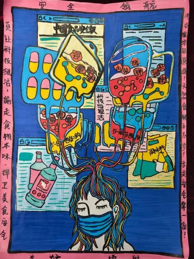 本次比赛分为平面设计和短视频两个赛道进行。在赛道一中,学生们积极参与到平面设计中来,提交了许多优秀的作品。参赛者们以手抄报、国画、水彩、素描海报等形式阐述并广泛传播安全文明知识。参赛者们围绕消防安全、食品安全、网络安全等方面展开创作,不仅色彩搭配大胆又和谐,设计思路也别出心裁,并且传递出深刻的安全知识理念。其中,孔晓彤同学的作品以彩色与黑白区域做对比,既突出了健康食物的诱人,又展现出不健康食品的问题 。内容选题很新颖,关注饮食健康,区分有益和有害食物。绘画生动,人物表情丰富,食物细节到位,能直观地传达食品安全的知识理念,夺得赛道一桂冠。