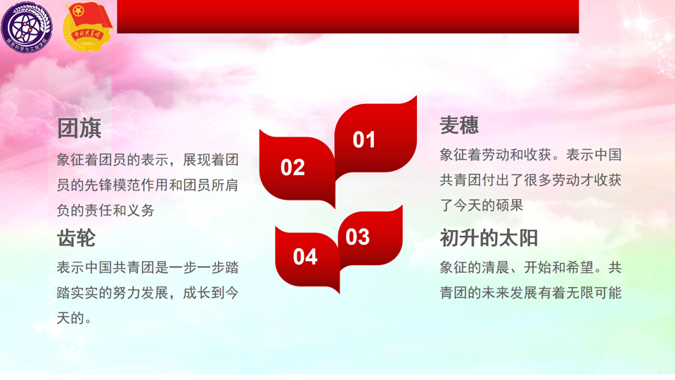 接着,主持人介绍了团旗团徽的构成元素,诠释共青团内涵。团旗彰显团员先锋模范与责任担当;麦穗代表劳动收获,寓意共青团奋斗成果;齿轮体现发展靠踏实努力;初升太阳象征希望与无限可能。能够激励团员铭记使命,传承奋斗精神,以积极姿态投身发展,在拼搏中创造美好未来。