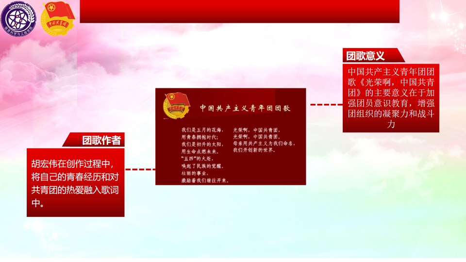 随后,主持人介绍了团歌中“五月的花海”“初升的太阳” 等意象,展现青年朝气与奉献精神,“五四” 唤起民族觉醒,激励继往开来。团歌意义在于强化团员意识教育,增强团组织凝聚力、战斗力,引领团员传承精神,在新时代勇担使命、开创新世界。