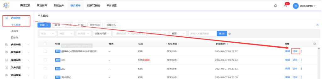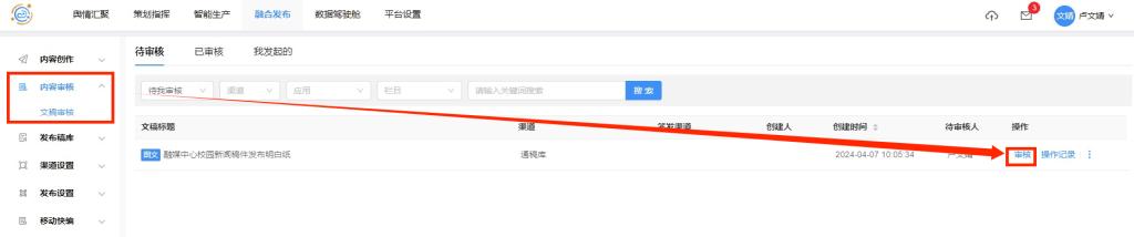 点击“内容审核→文稿审核→在待审核文稿中点击审核(如需修改可在审核界面修改)”