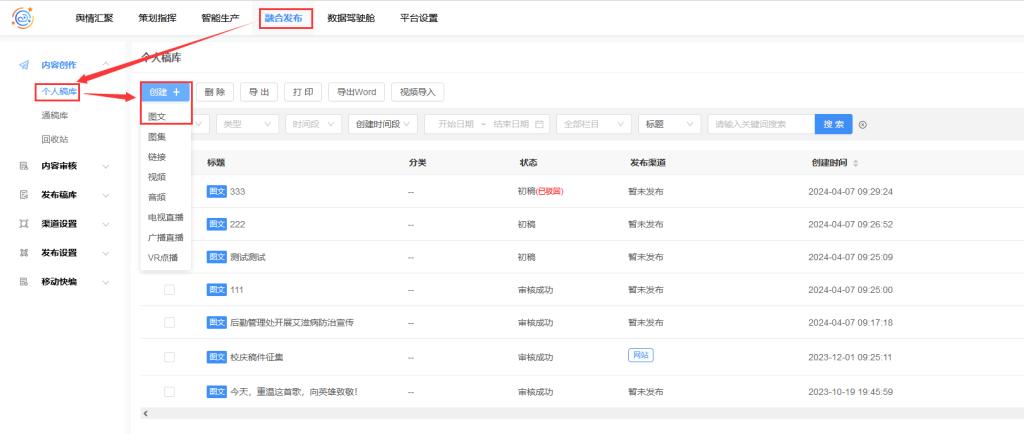 2、进入平台后点击“融合发布→内容创作→个人稿库→创建→图文”
