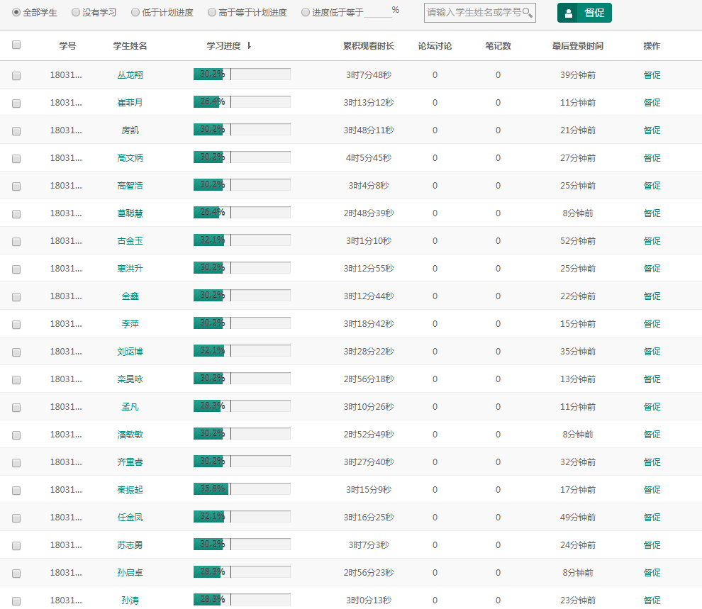 2. 根据实际视频总时长确定视频学习时间。视频学习时间约50分钟。通过后台进度查询督促学生按时完成视频学习。