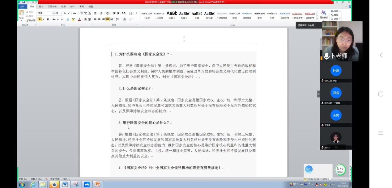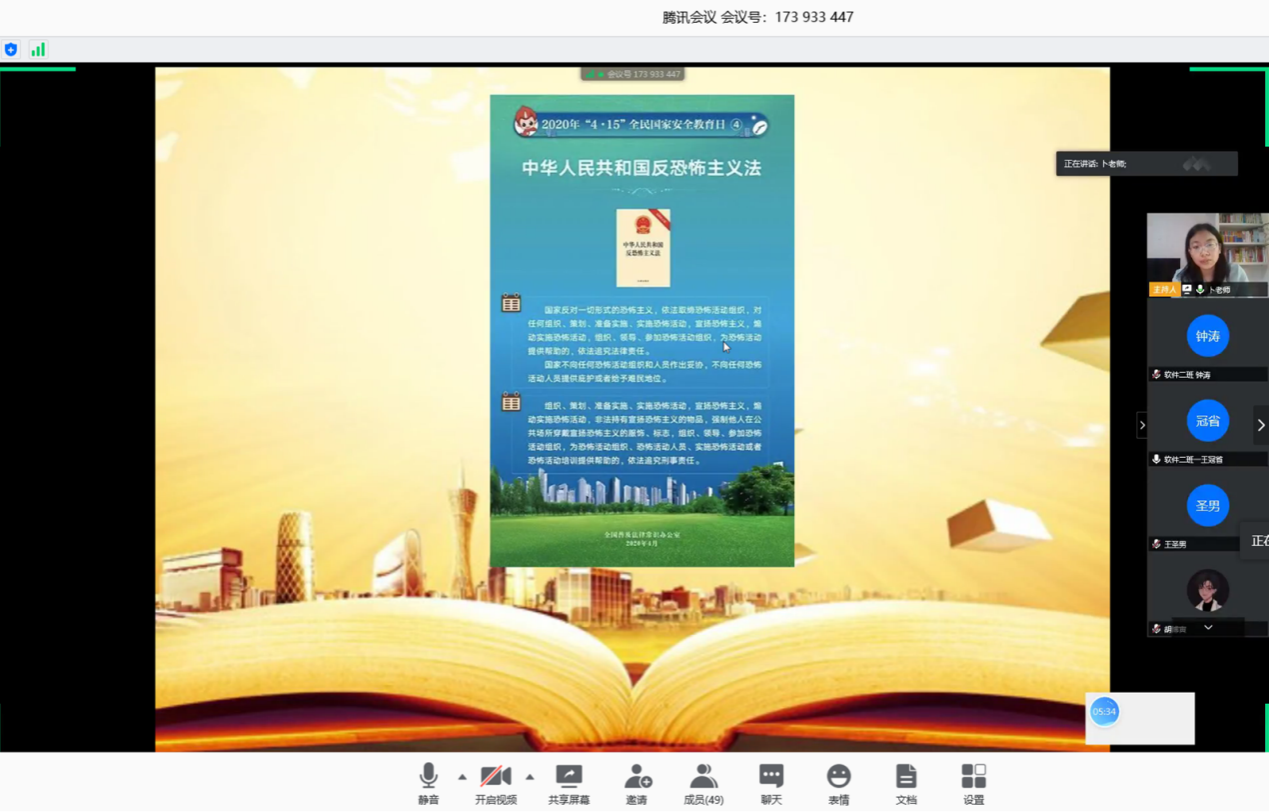 2020年4月15日是中国第五个“全民国家安全教育日”,为增强师生国家安全意识和自觉维护国家安全的责任感和使命感,推动校园安全工作,结合当前新冠肺炎疫情防控形势,18级软件专业1.2班于4月14日下午组织全班学生进行了“同上一堂国家安全教育课”云主题班会,55名学生参加会议,班主任卜凤菊老师主持会议。