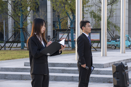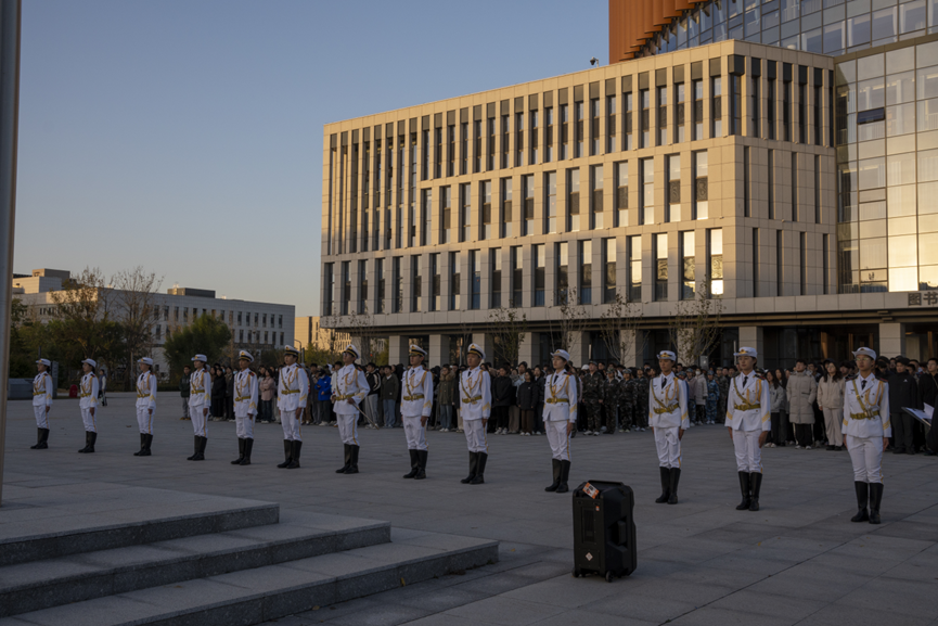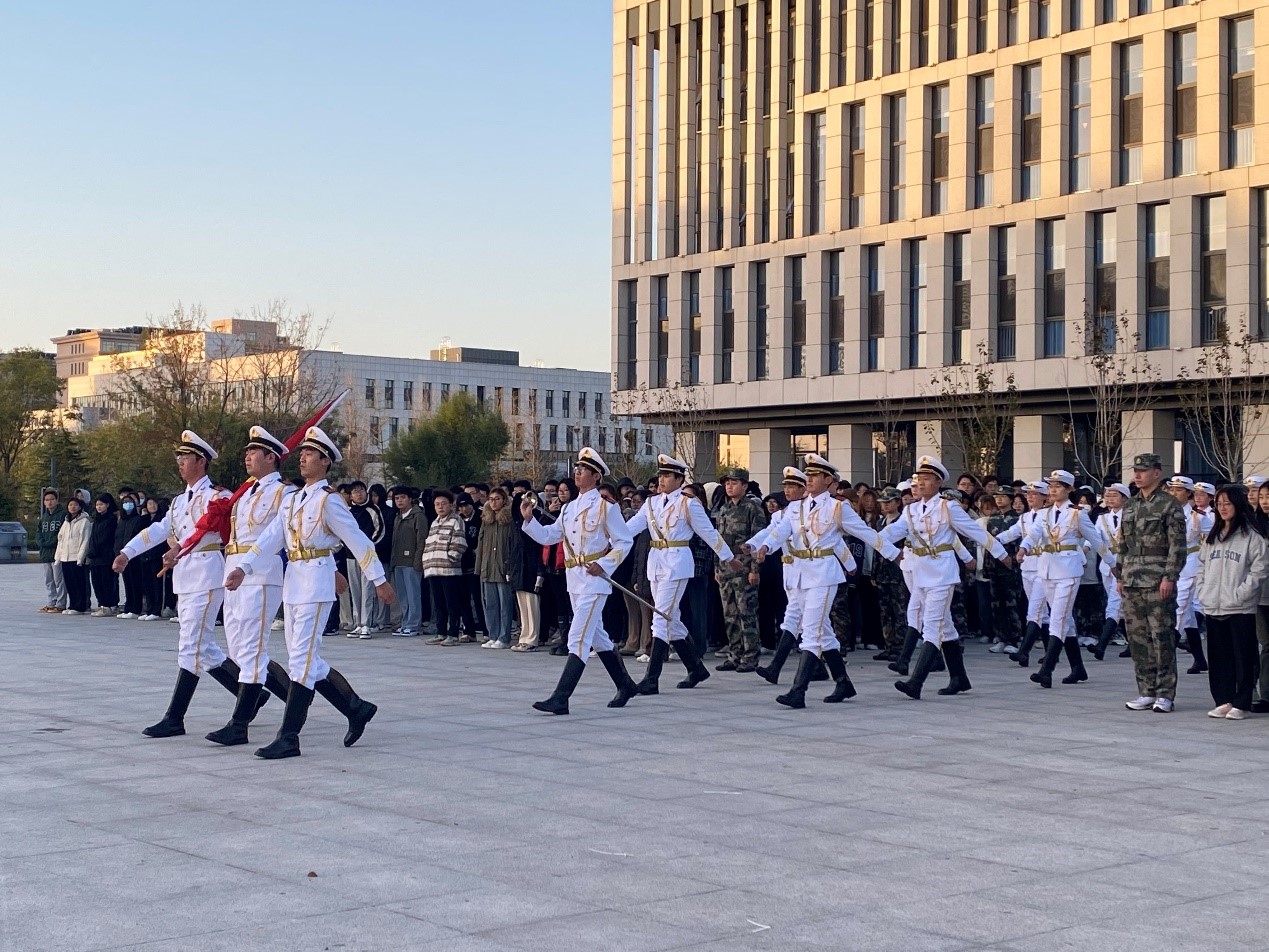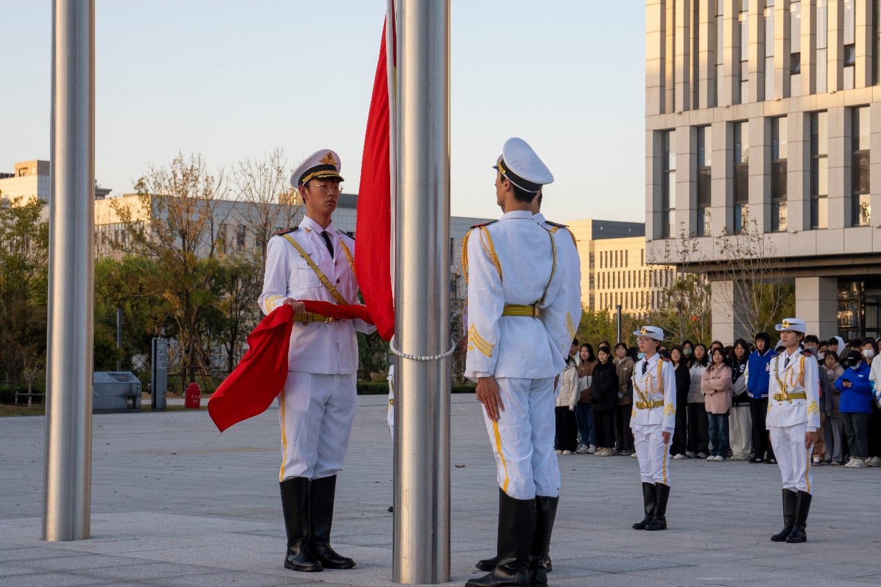 踏着清晨第一缕朝阳,国旗护卫队整齐划一、铿锵有力的步伐响彻庄严肃穆的广场。随后,庄严的《义勇军进行曲》响起,全场学子迎着朝阳,注视国旗,一同高唱国歌,声音嘹亮雄厚、朝气蓬勃。鲜艳的五星红旗迎风飘扬,在晨光下熠熠生辉,11月清晨的寒风也丝毫吹不灭同学们似火的热情。