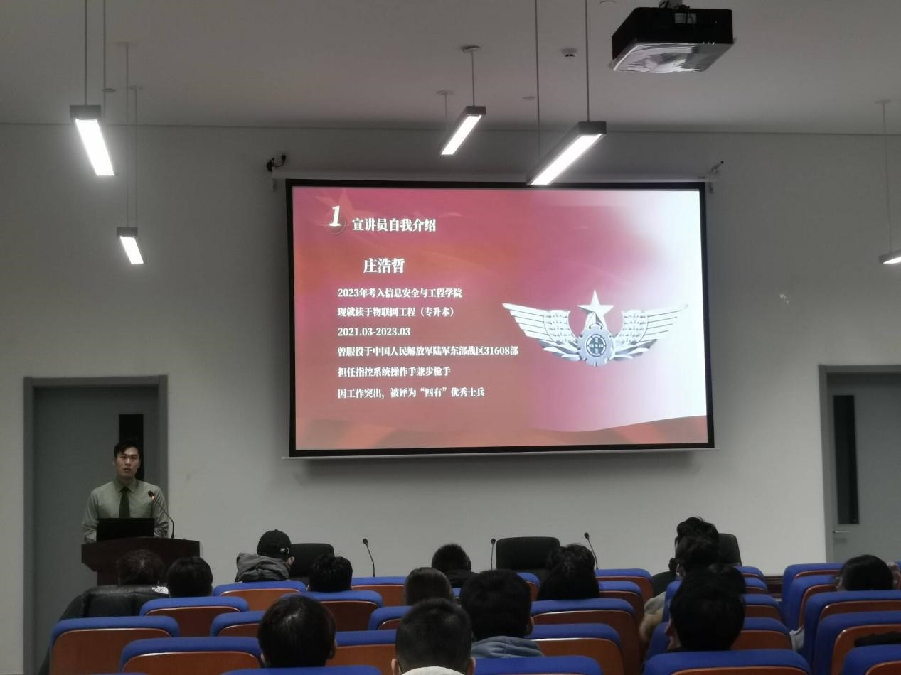 本次讲座主要分为五项流程。讲座第一项为宣讲员自我介绍,宣讲员庄浩哲曾服役于中国人民解放军陆军东部战区31608部,退役之后复学读书,用自己的亲身经历来为大家讲解征兵相关问题。
