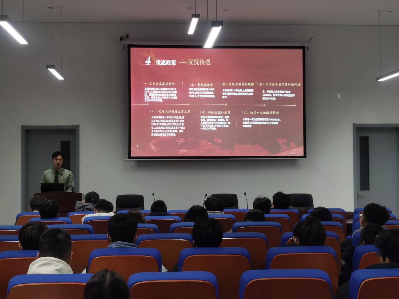 第四项,由宣讲员为大家讲解当兵入伍的优惠政策。宣讲员庄浩哲分别从优抚待遇、发展前景、复学升学、就业安置四个方面介绍了了大学生当兵入伍的益处。