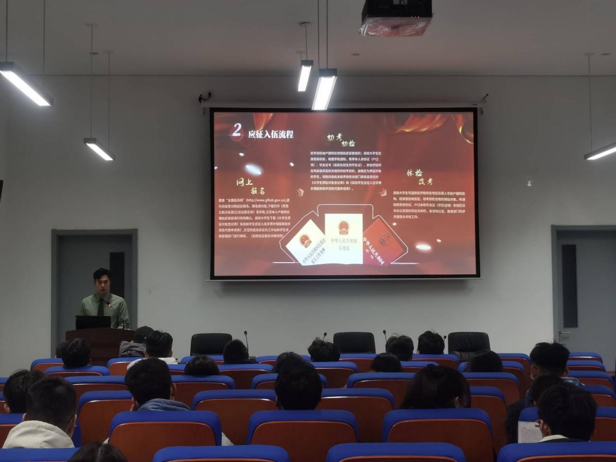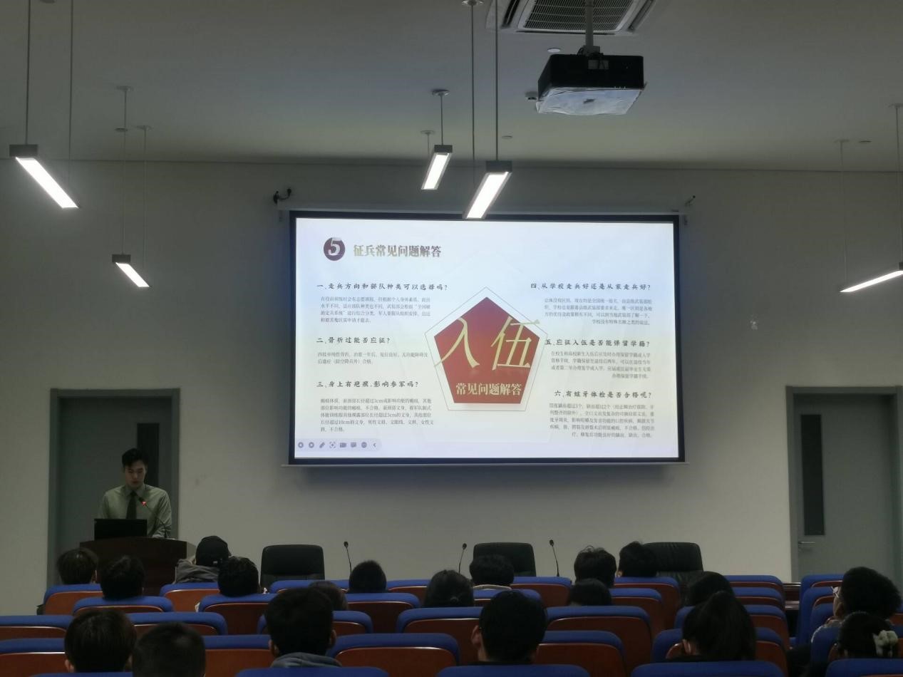 讲座进行第二项,由宣讲员庄浩哲来为大家详细讲解应征入伍流程。不仅为学生们介绍了应征报名详细流程,并且分别介绍了入伍流程中走访调查、预定新兵、张榜公示、批准入伍四个阶段,为想要参与征兵的同学提供了详细的报名方法和渠道。