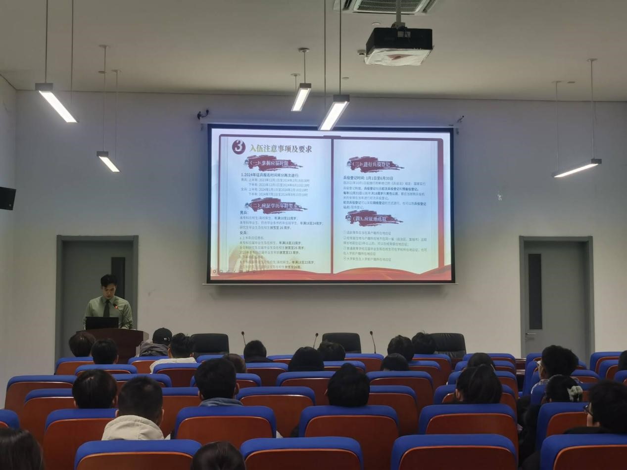第三项为入伍注意事项要求的明确和讲解。宣讲员庄浩哲分别将应征年龄、应征时限,应征地和身体政治条件等几个方面来介绍入伍要求和注意事项,使在座学生们对当兵入伍有了更加深入的了解和认知。