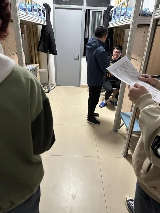 检查过程中,领导一行首先来到了男生宿舍区。他们走进每一间宿舍,认真查看了宿舍的卫生状况,包括床铺整洁度、地面清洁度、物品摆放情况等。同时,他们还与学生进行了亲切的交流,询问了同学们在生活中的困难和需求,鼓励大家要养成良好的卫生习惯,共同维护宿舍的整洁和卫生。