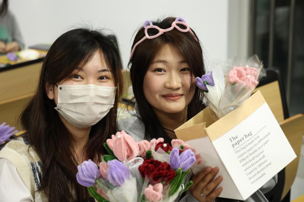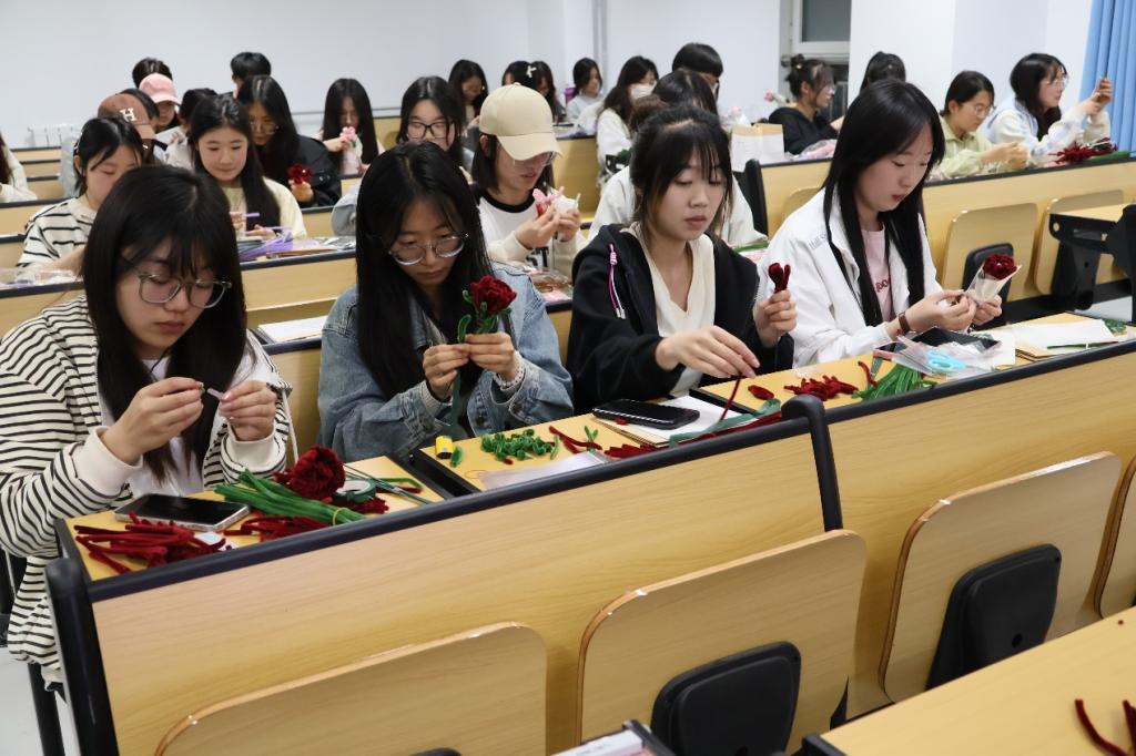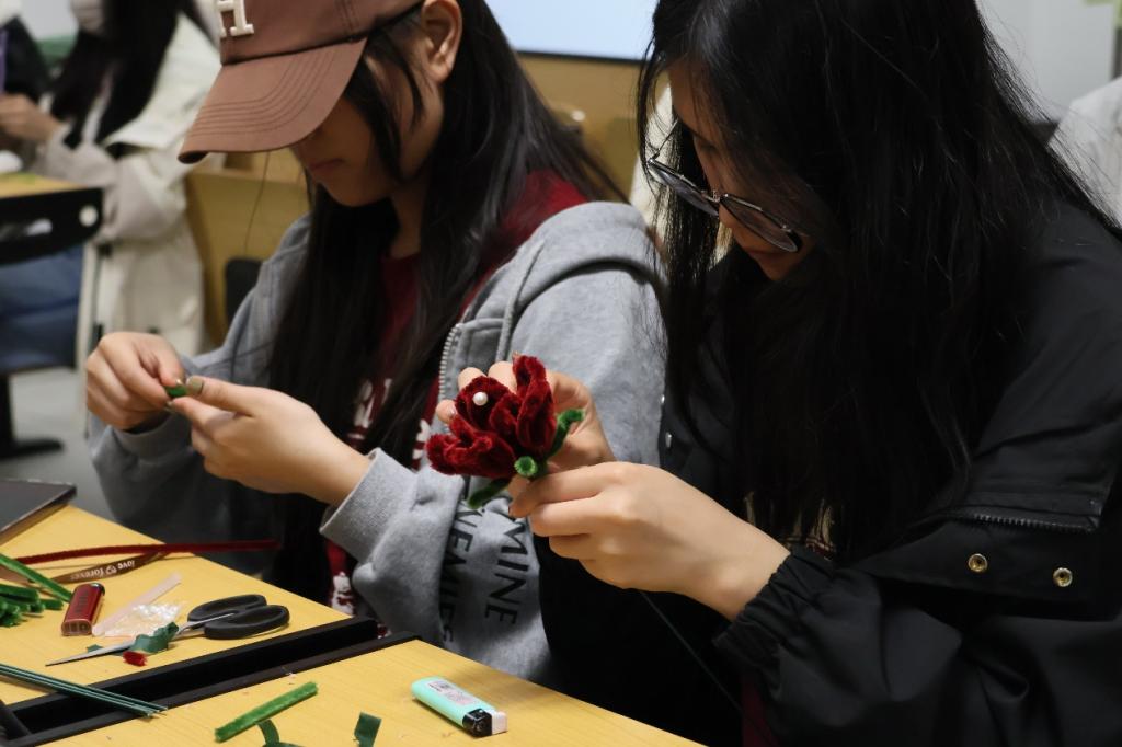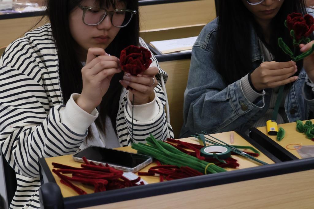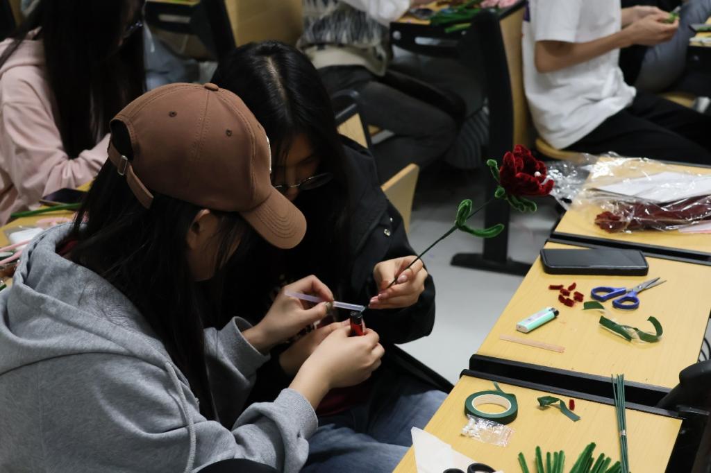 活动现场,信息科学与工程学院老师和学生会负责人耐心指导志愿者如何制作花束。志愿者认真学习并充分发挥想象力,用五颜六色的扭扭棒,根据花束的形状、颜色以及大小进行调整、缠绕和粘贴,制作出一束束精致而美丽的花束。