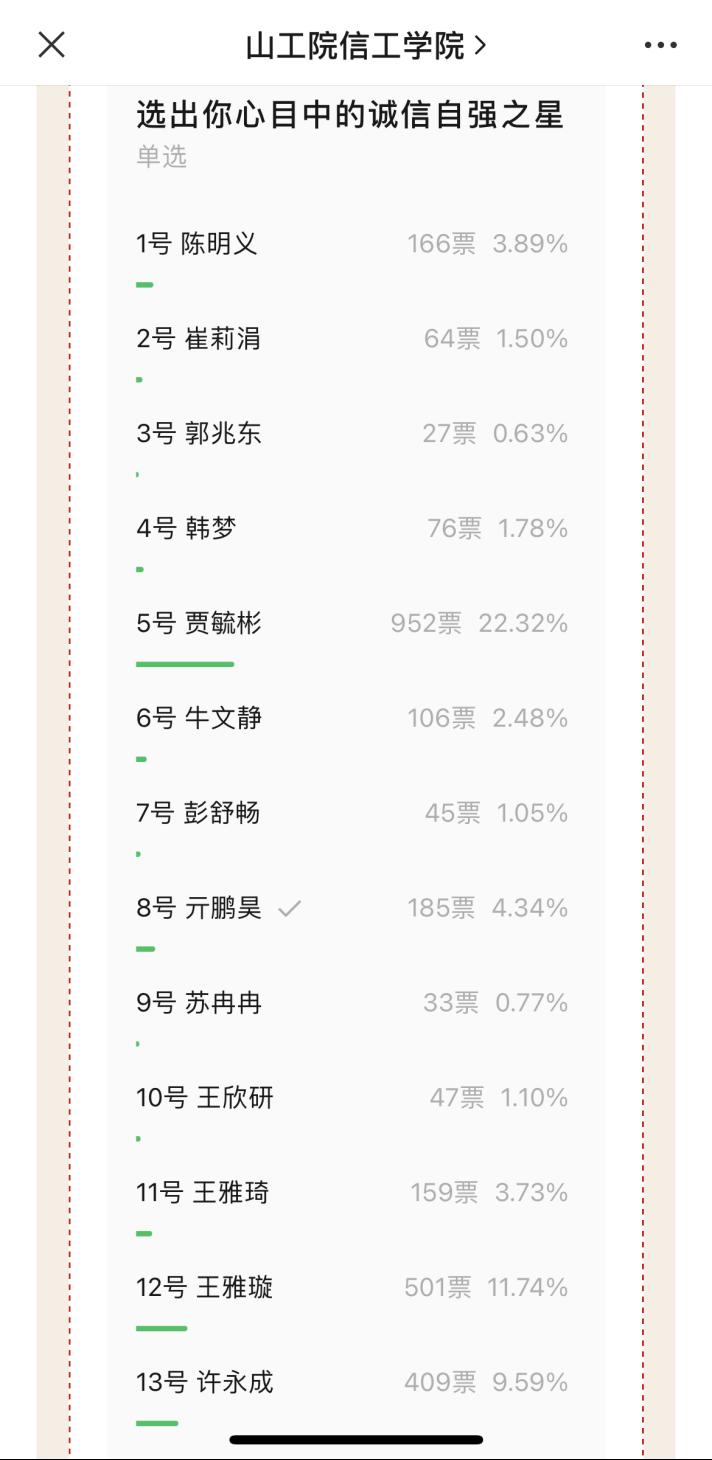 全员评选:大众参与传播诚信风气。“诚信自强之星”申报面向全院学生,学生申报经初步评选后择优推选了15位学生进入了线上大众投票及线下评审环节。为广泛宣传,我院在微信公众号上开通了网上投票通道,全院师生共同参与评选,评选出心目中的“诚信自强之星”。线下评审由我院领导、辅导员、教师以及学生代表组成的评审小组根据候选人的事迹材料,诚信记录以及自强精神等方面进行打分。经过激烈角逐,最终评选出了五位在诚信与自强方面表现突出的优秀代表,他们分别是许永成、杨淀皓、宗子雅、贾毓彬、王雅璇。