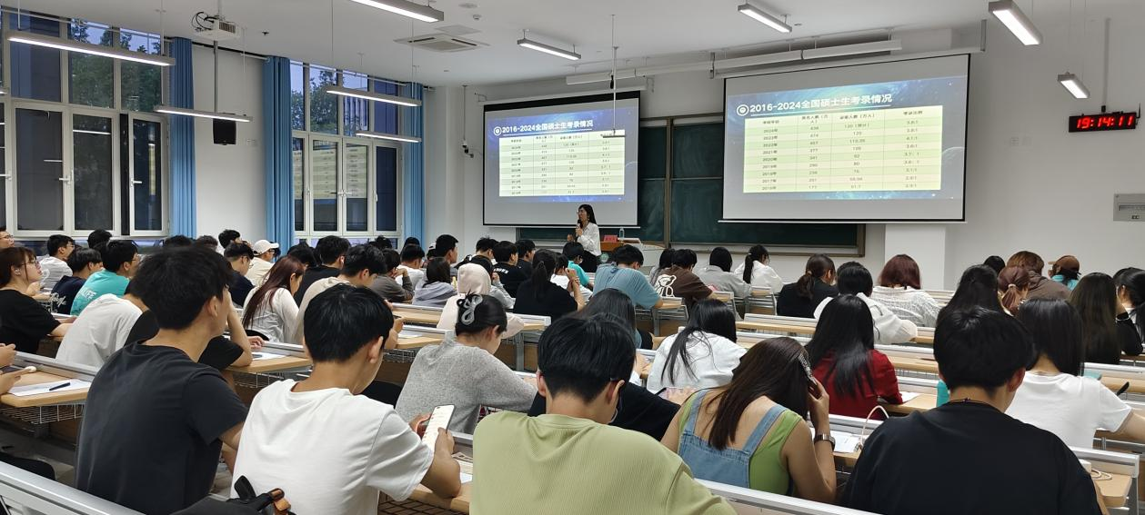 在本次规划分析启动备考讲座中,主讲董红燕老师通过详尽的数据分析,对近几年的考研录取率及各专业分数线进行了深入的比较和解读,使学生们对当前的考研形势有了更为清晰和准确的认识。董老师不仅揭示各专业之间的竞争差异,还指出未来考研趋势的可能变化,为学生们提供宝贵的信息。