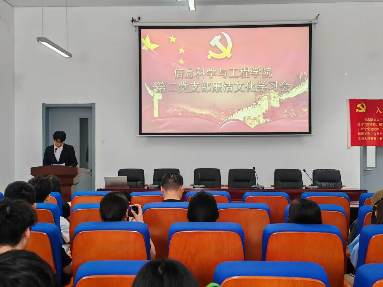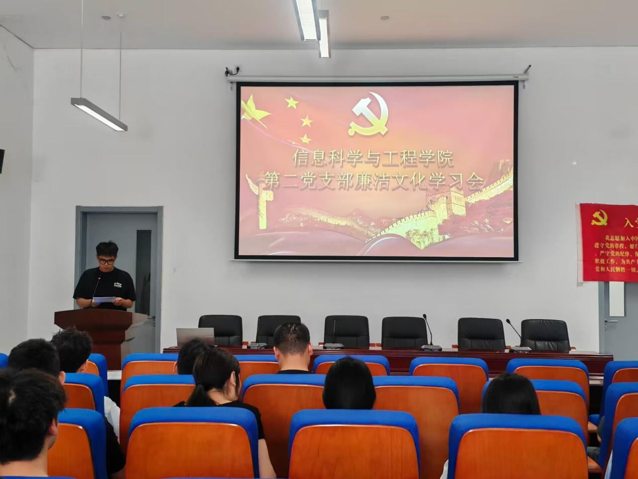 为进一步贯彻落实习近平新时代中国特色社会主义思想,深入学习廉洁文化,提高党员党性修养,437ccm必赢国际官网信息科学与工程学院学生第二党支部于2024年6月5日在理工东楼A101围绕“廉洁文化”展开学习会。出席本次活动的有党总支副书记张兴波,学生第二党支部书记赵丛楠,辅导员夏天宇、赵晓芳、李洁璐、孙兆柱。