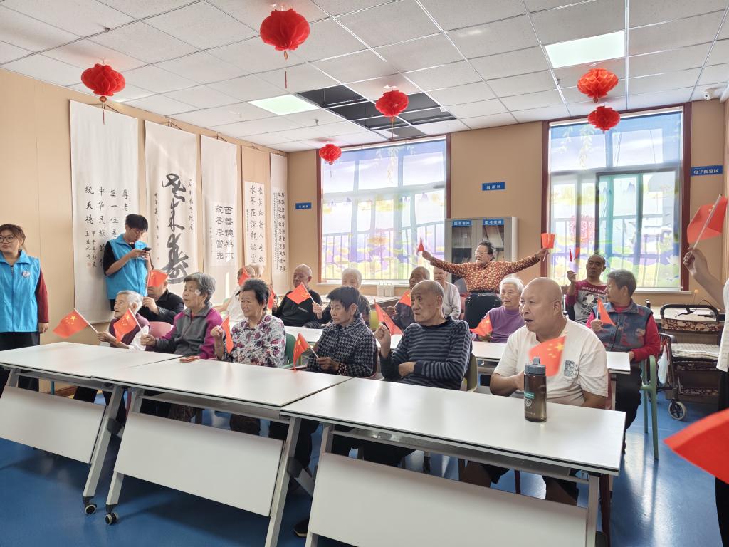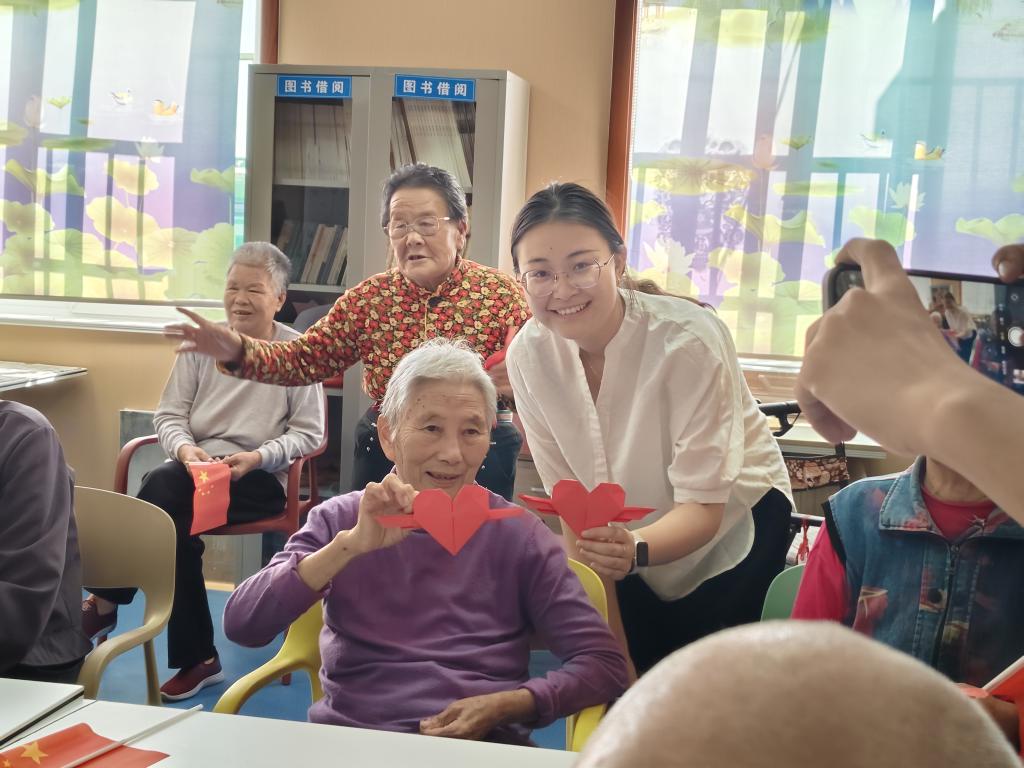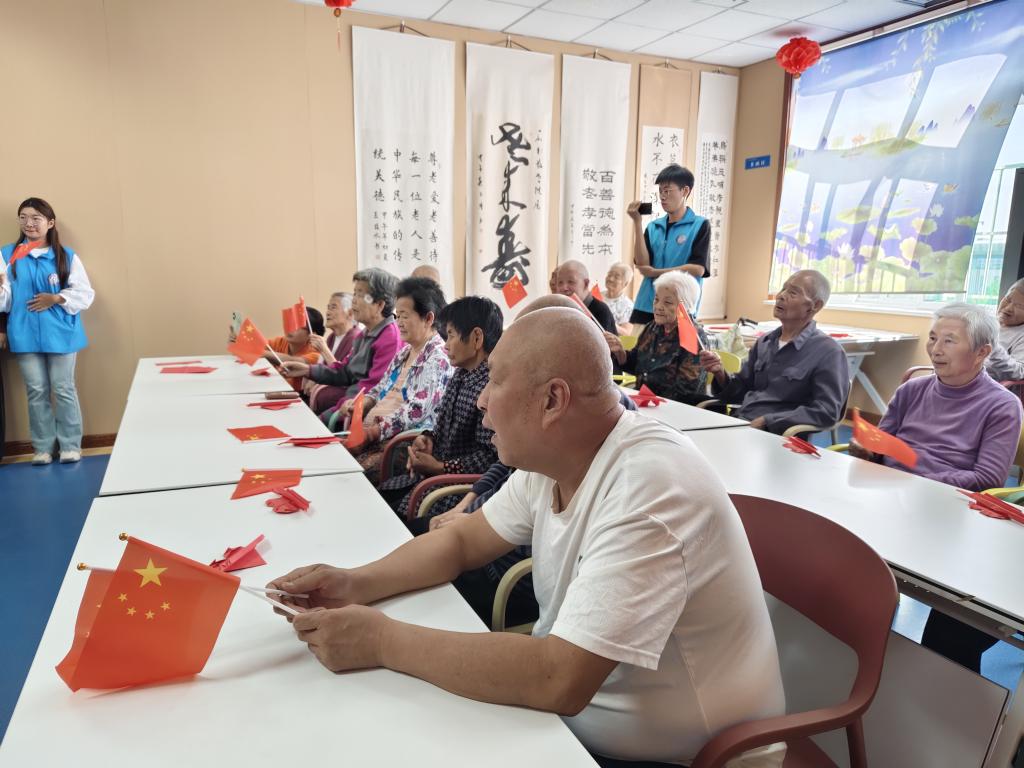 创造美与乐趣,促进身心健康,志愿者带领老人们进行手工制作。大家共同制作五星红旗、国庆贺卡等工艺品为祖国母亲庆生。在制作手工艺品的过程中,老人们充分发挥创造力和想象力,彼此交流展示作品。这不仅让他们体验到创作的乐趣和成就感,同时还帮助他们感受艺术的美感和魅力。