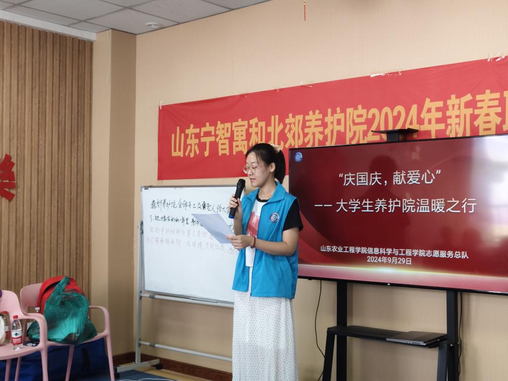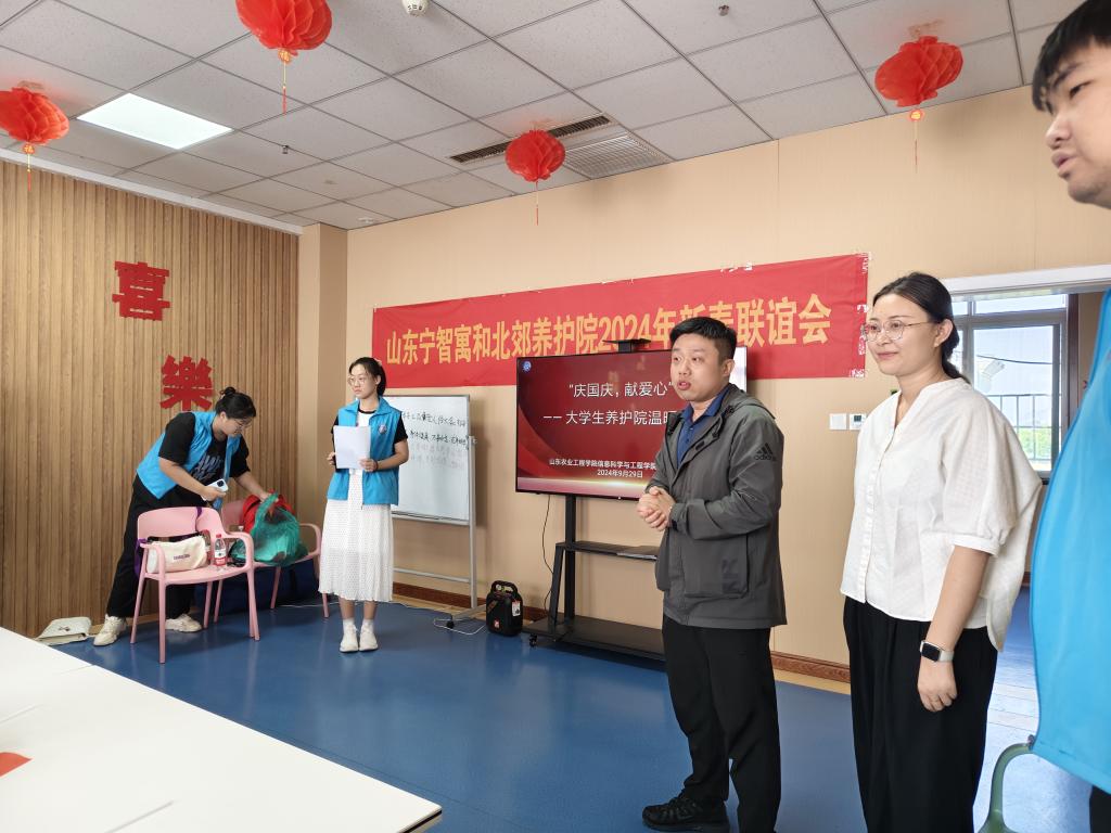 情暖夕阳,岁月留香。为进一步弘扬中华民族尊老、敬老、爱老的传统美德,践行社会主义核心价值观,信息科学与工程学院于2024年9月28日在周村区北郊镇养护院组织开展了“庆国庆,献爱心 —— 大学生养护院温暖行”志愿活动。
