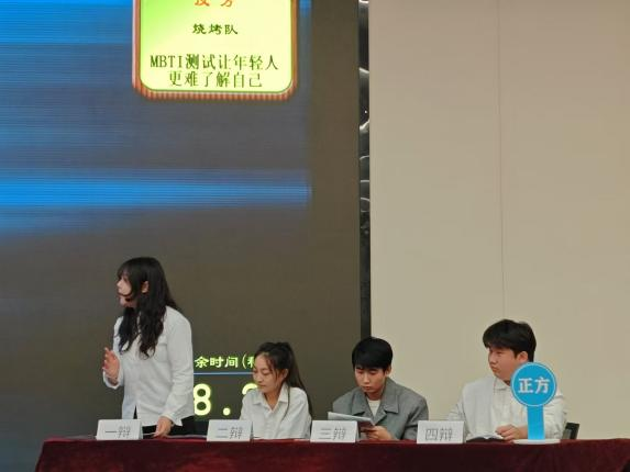 反方辩手也毫不示弱,他们的观点是“MBTI测试让年轻人更容易了解自己”,反方一辩在立论时旁征博引,用丰富的事例和数据增强了论点的说服力。在攻辩环节,反方二辩和三辩反应迅速,针对反方的陈述,提出一连串尖锐的问题,如连珠炮般向对手发起攻击,现场气氛瞬间被点燃。