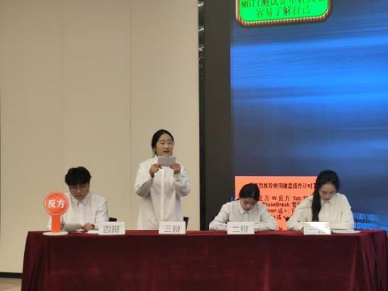 辩论场上,正方辩手立场坚定,论点鲜明,他们的观点是“MBTI测试让年轻人更难了解自己”。一辩开篇立论,有条不紊地阐述观点,逻辑严谨,为全场辩论奠定了坚实的理论基础。在随后的攻辩环节中,正方二辩和三辩言辞犀利,针对反方的漏洞连连发问,步步紧逼,不给对手丝毫喘息的机会,展现出了出色的应变能力。