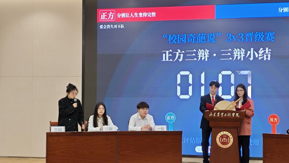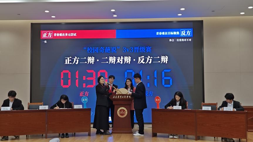 辩古今是非,论天地对错。为培养学生批判性思维,提升语言表达能力,增强团队协作能力,拓宽知识层面,丰富知识储备,巩固学生综合素质,由校团委主办,稷下辩论社、信息科学与工程学院承办的第一届“校园奇葩说”辩论赛于2024年11月25日晚19:30在行政楼A116举行。大赛指导老师、信工学院评委赵丛楠,食品学院评委田腾飞,商学院评委姬雅婷,机电学院评委安明康,信工学院评委徐瑾、李洁璐、马青超共同出席此次比赛。