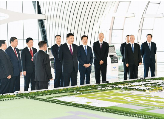 2019925日上午,北京大兴国际机场投运仪式在北京举行。中共中央总书记、国家主席、中央军委主席习近平出席仪式,宣布机场正式投运并巡览航站楼。这是习近平在综合交通中心听取机场综合交通体系建设情况介绍。 新华社记者 谢环驰/