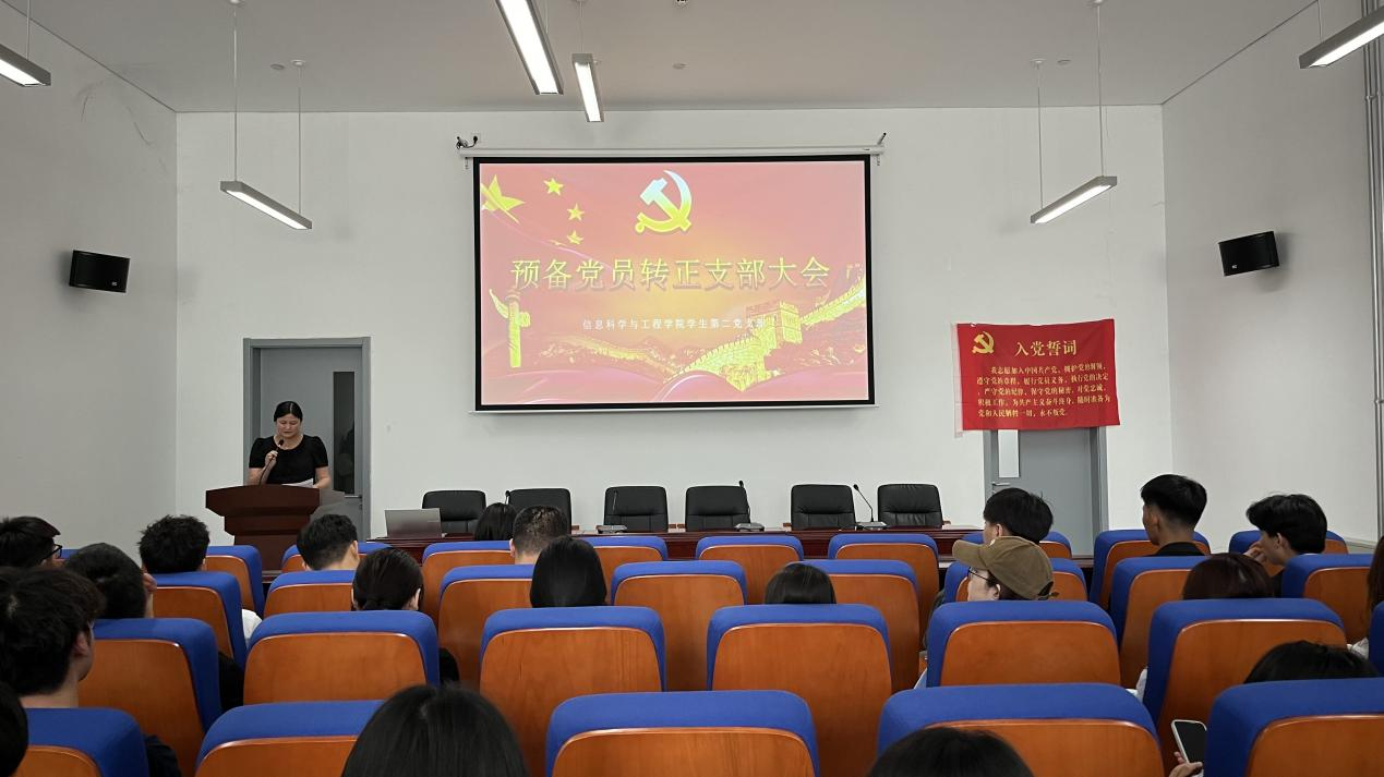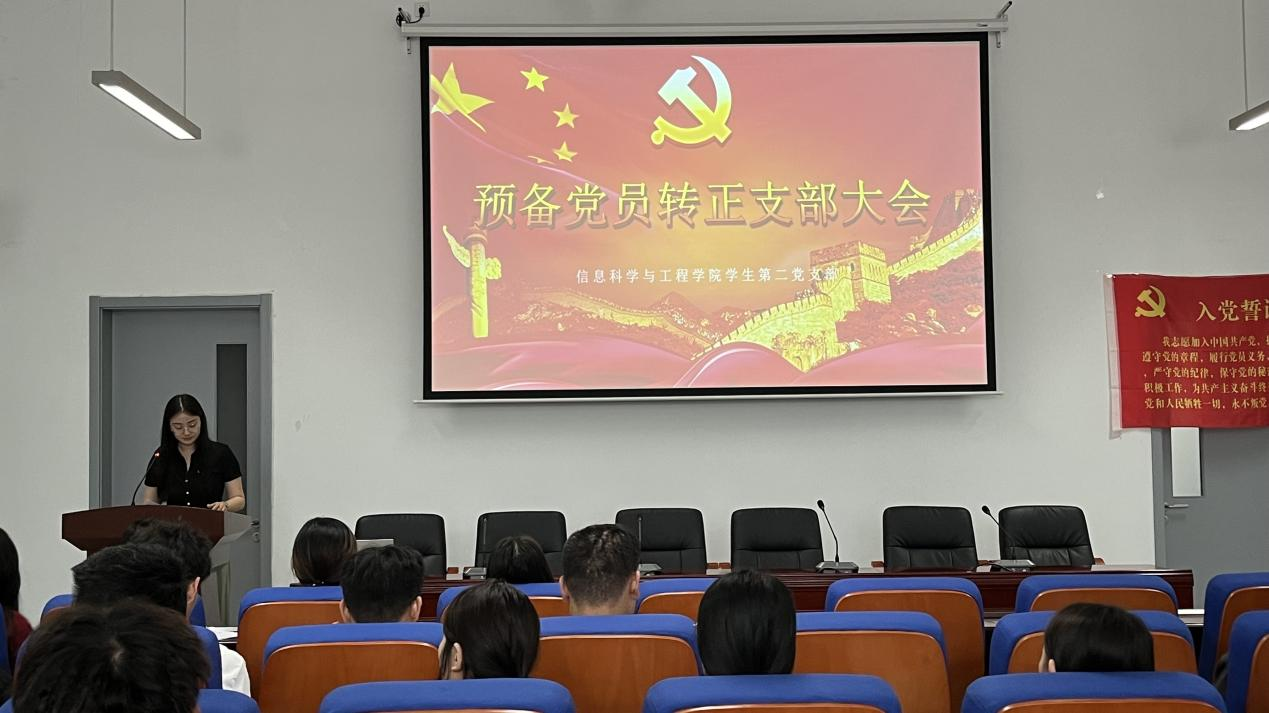 2024年6月6日,信息科学与工程学院学生第二党支部于理工东楼A101隆重召开预备党员转正支部大会,共同审议了多名预备党员转为正式党员的重要时刻。本次会议由学生第二党支部书记赵丛楠主持,党总支副书记张兴波,辅导员夏天宇、赵晓芳、孙兆柱、李洁璐出席了会议。