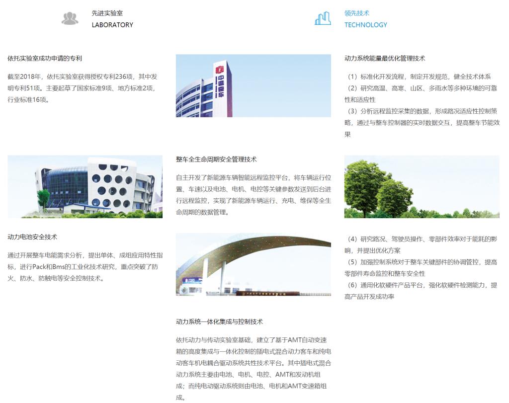 公司拥有客车业行业首个国家级实验室、国家级技术中心、博士后科研工作站,是中国客车行业唯一一家承担三项国家"863"重大课题的企业。凭借多年的技术积淀,公司联合国内知名院校和科研院所,致力于客车安全、节能以及新能源技术研究,现已获得受理专利200余项,参与制定了数十项国家标准,并荣获30多项国内外大奖,推动了行业进步。公司成为"国家级高新技术企业"、"国家火炬计划重点高新技术企业"、"国家汽车整车出口基地企业”。