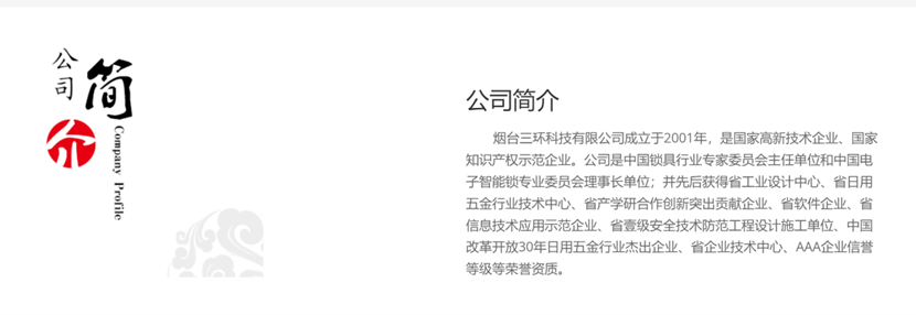 烟台三环科技有限公司是烟台三环锁业集团有限公司,企业技术中心所在地、省级高新技术企业,拥有一个国家实验室和一个山东省工程技术研究中心,是山东省产学研合作创新突出贡献企业和国家二级保密资格单位,被市政府授予科技自主创新“双十”工程示范企业。公司成立于2001年,主要从事用电子信息、计算机、生物识别技术控制的机电一体化高端智能网络门禁系统产品的研发、生产、销售及技术服务,涵盖门、锁、箱、柜等领域终端产品及管理软、硬件系统。近年来,科技公司各项业务稳步增长,市场领域不断扩大,产品与服务已涵盖政府、军队、金融、电力、物流、高档住宅小区等重要安防场所,产品销售收入和利税均保持较快增长。公司位于烟台市芝罘区西南河路47号,地处市区繁华路段,交通便利。公司秉承“为国家和人民的安全服务”为宗旨,以“创建中国一流的安防产品研发服务基地”为发展目标,以广阔胸怀邀业内精英加盟,共同致力于中国安防事业的发展。