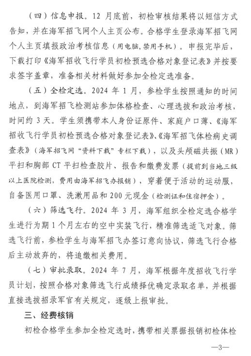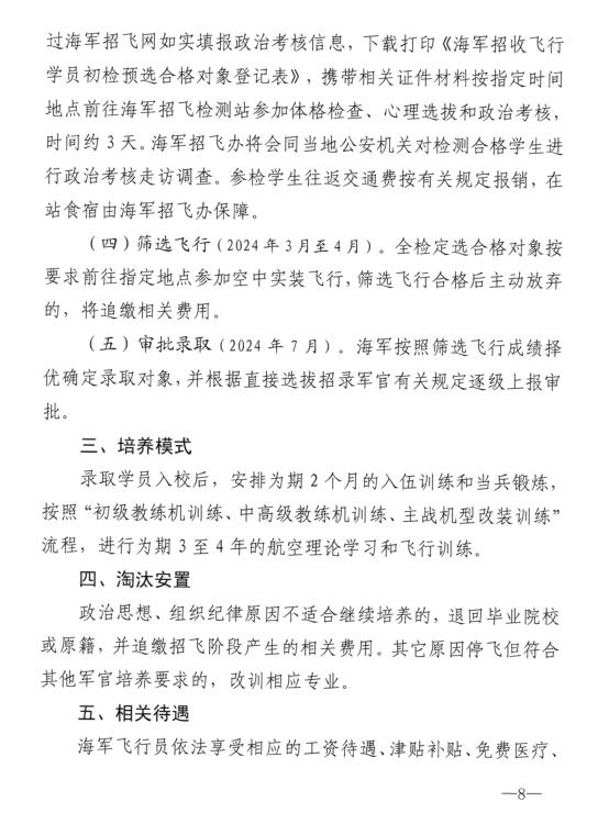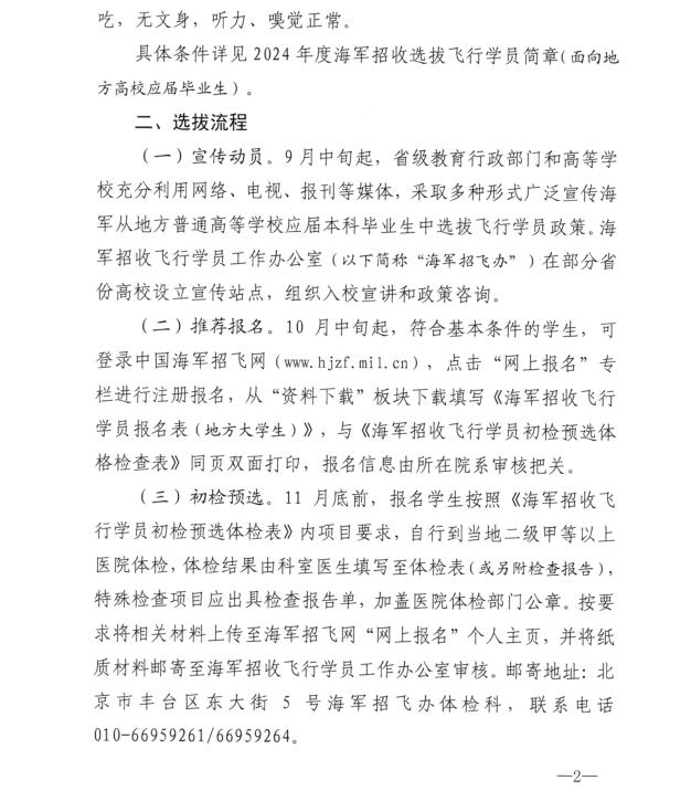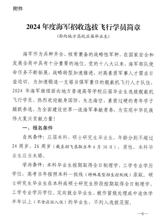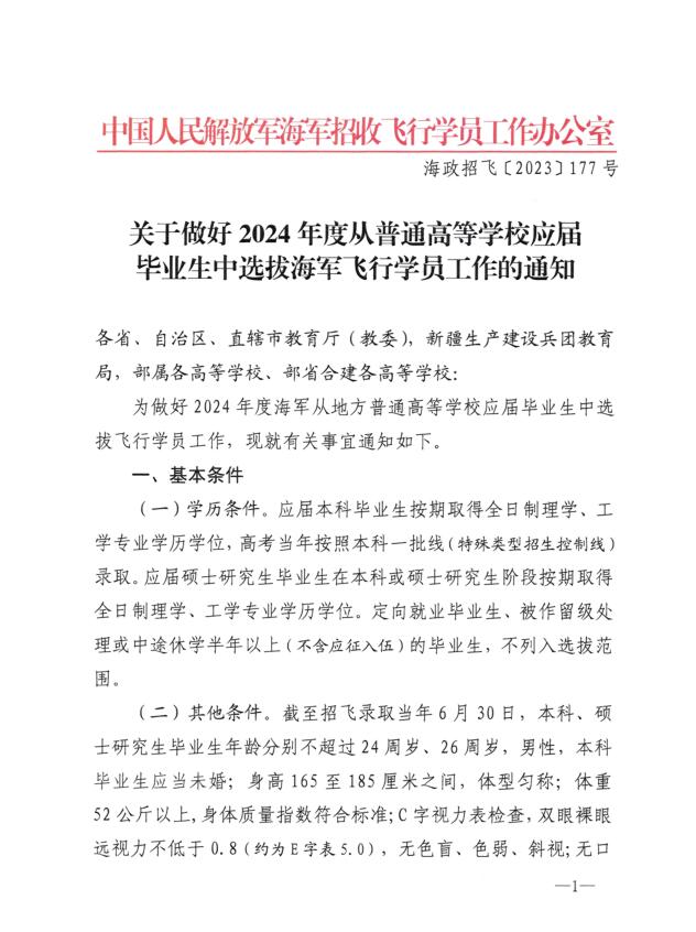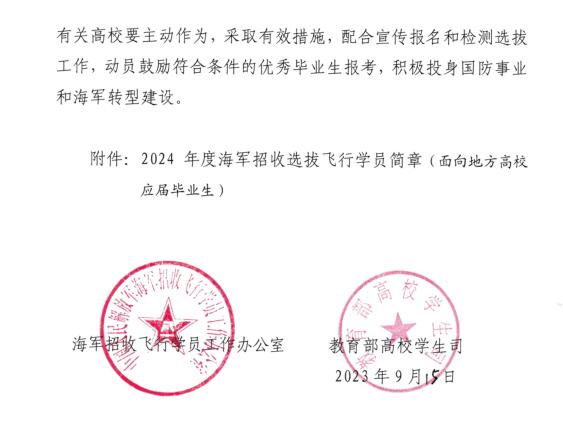 关于做好2024年度从普通高等学校应届毕业生中选拔海军飞行学员工作的通知
