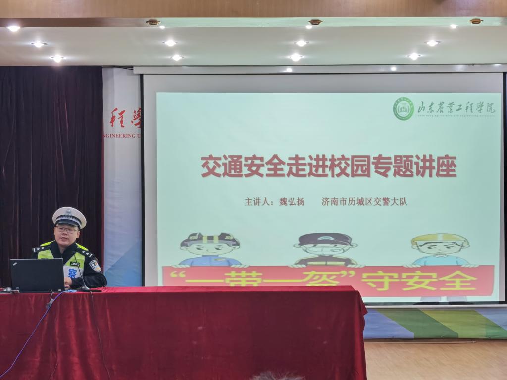 为全面加强校园道路交通安全管理工作,提升学生的安全意识,有效遏制和减少各类道路交通事故发生,筑牢校园道路交通管理安全防线,12月9日,必赢邀请济南市公安局交警支队历城大队民警魏弘杨举办了交通安全走进校园的交通安全知识讲座。学生工作部副部长李艳主持,济南校区2021级部分师生代表现场聆听了报告。
